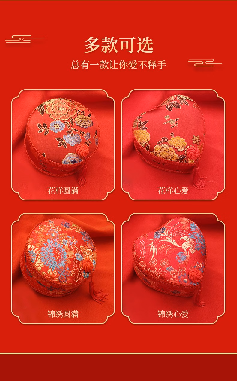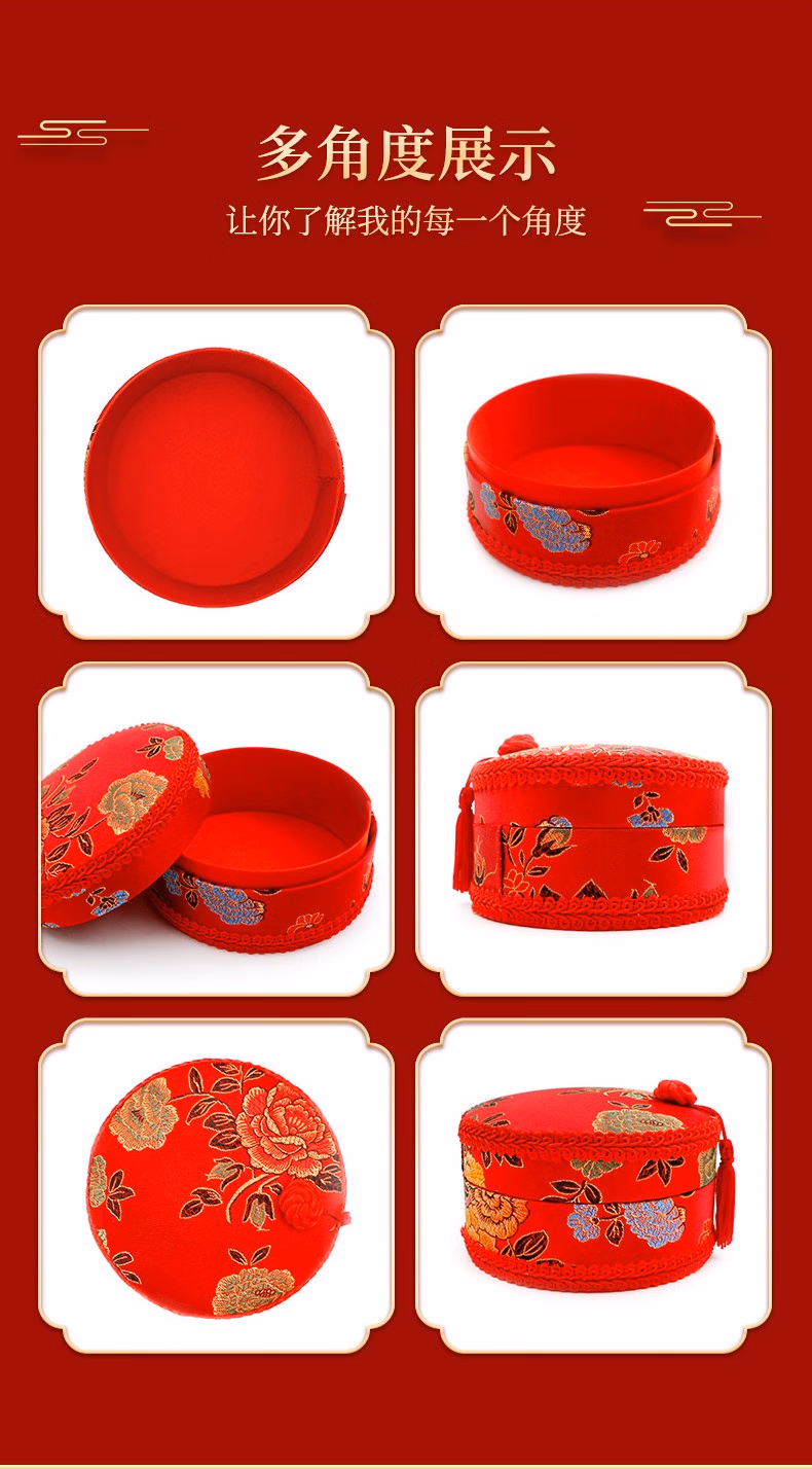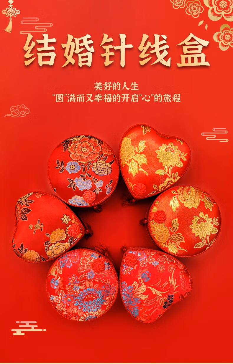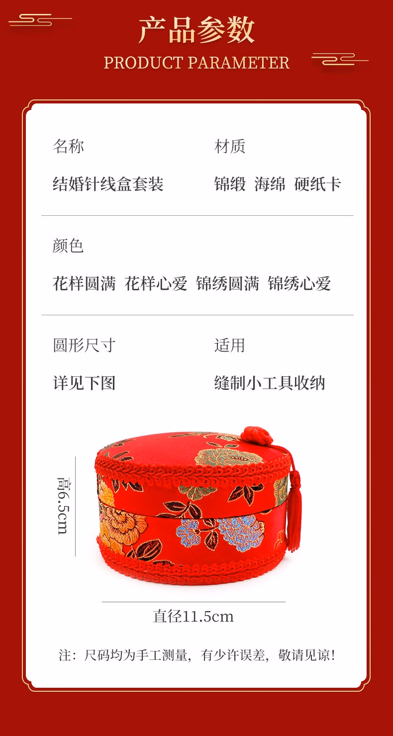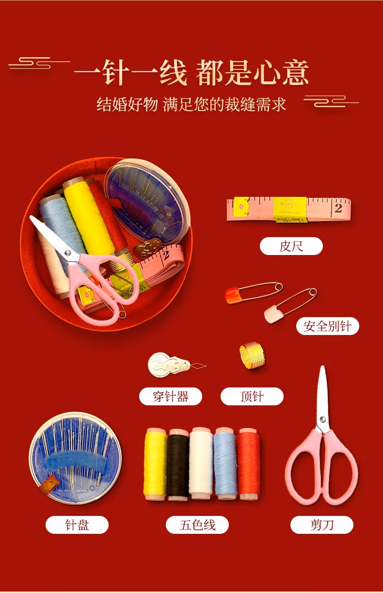 结婚针线盒套装婚庆针线包陪嫁嫁妆新娘家用剪刀缝纫针布艺缝纫套装便携迷你红色多功能收纳盒花样圆满(配针线套装)
