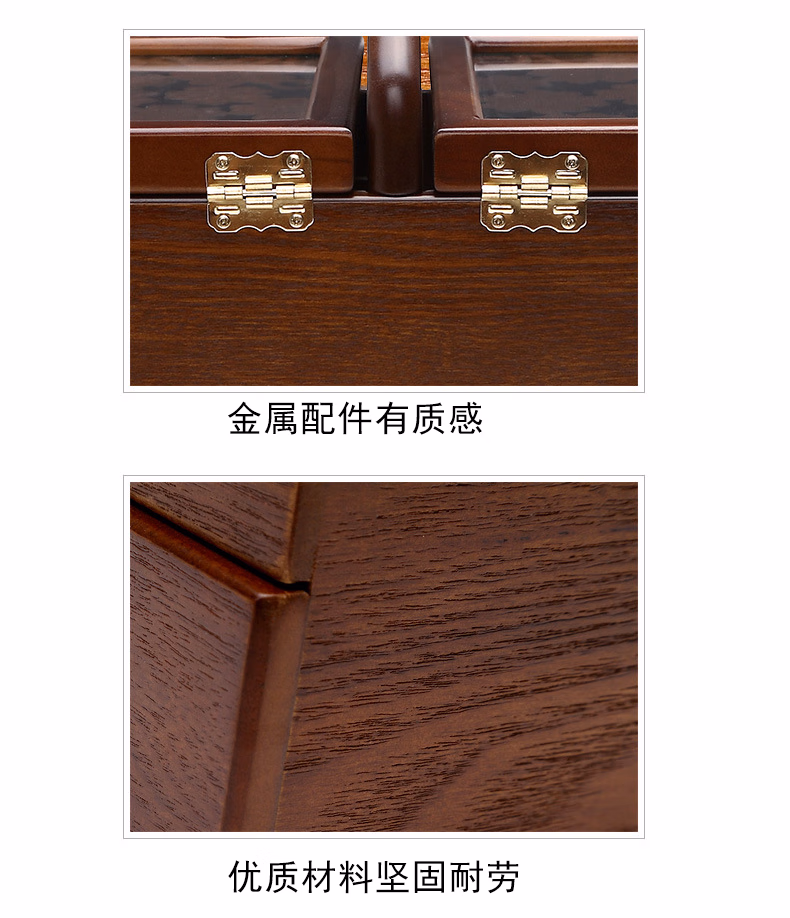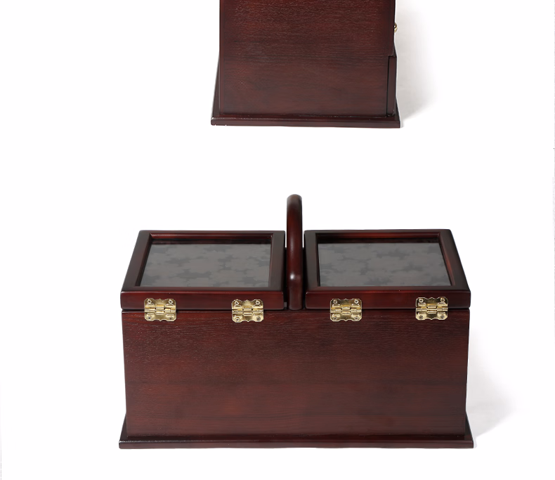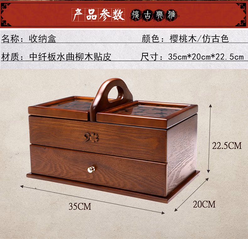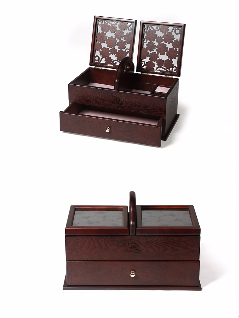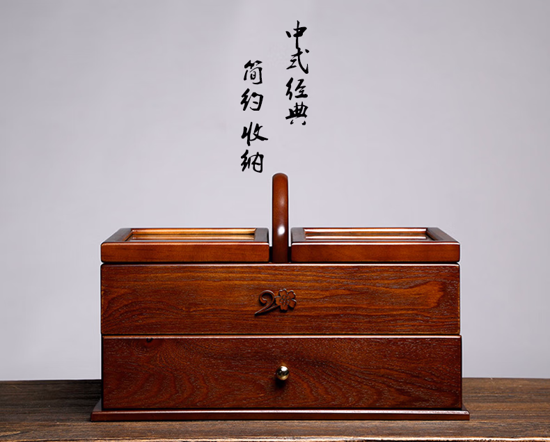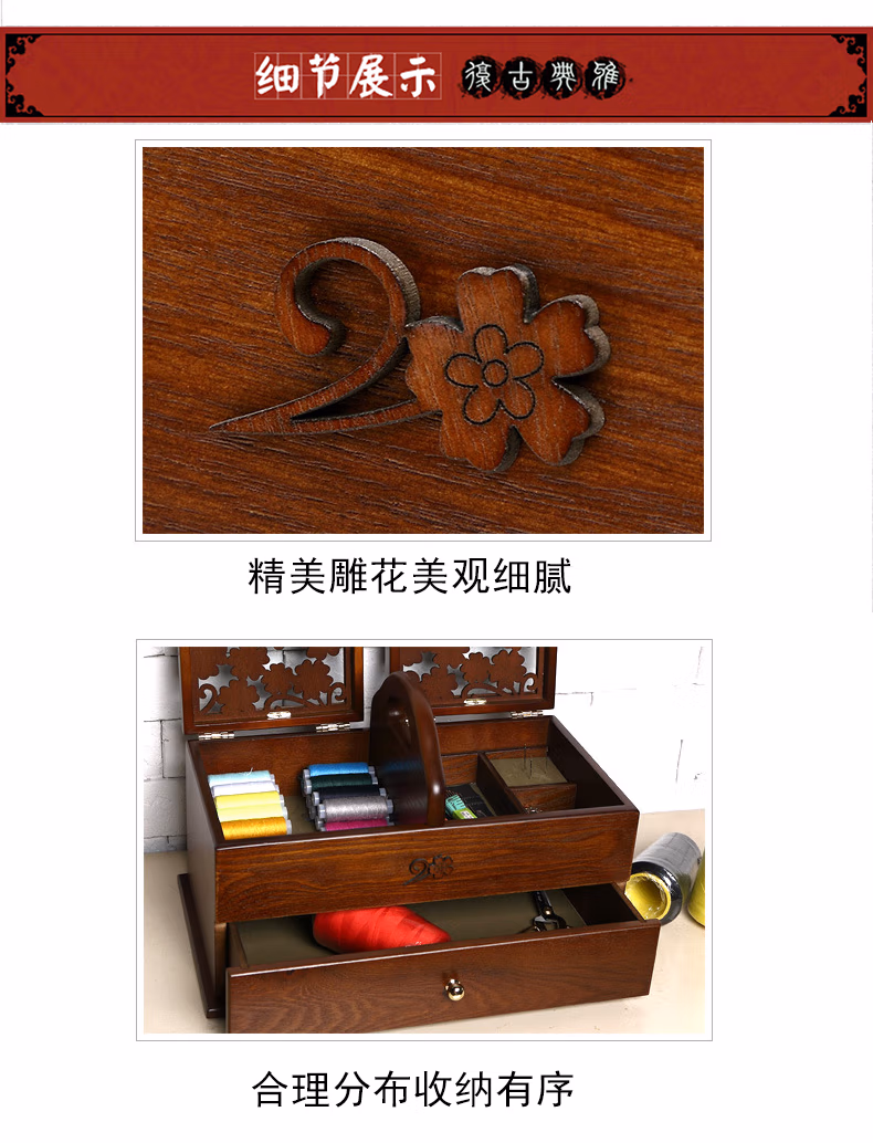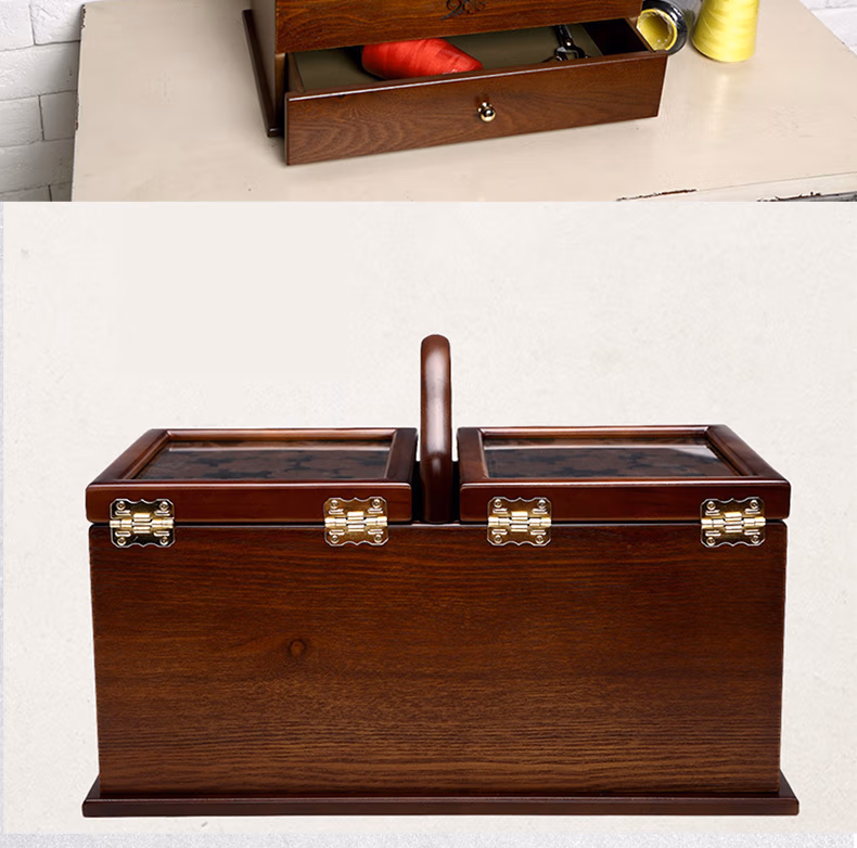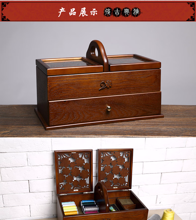 初心如雪针线盒复古木质化妆品收纳盒家用针线盒有盖梳妆台大号木制剪刀针线缝纫整理盒仿古色针线盒