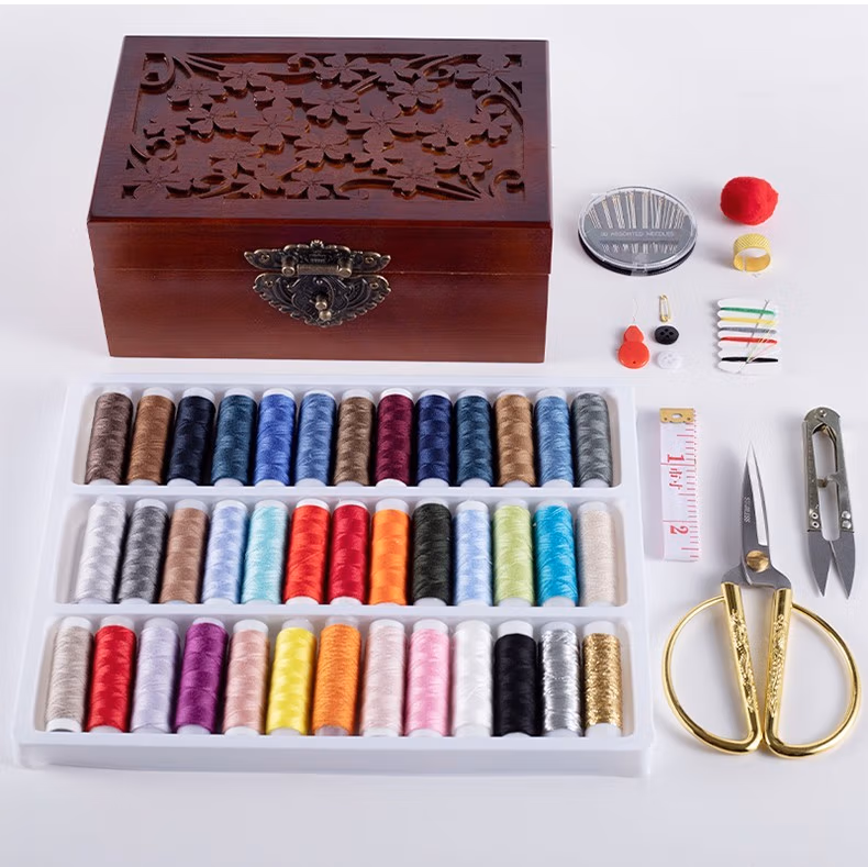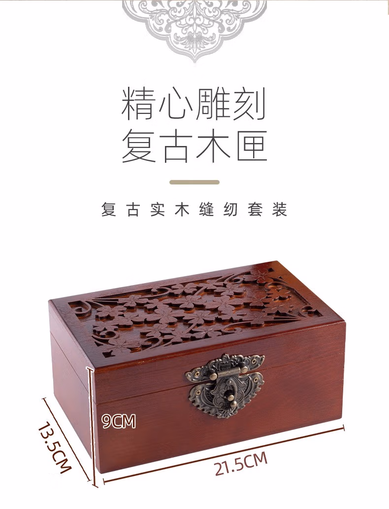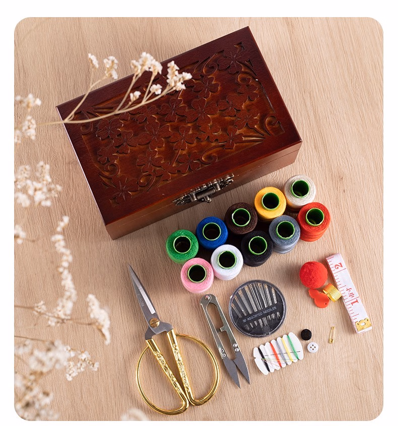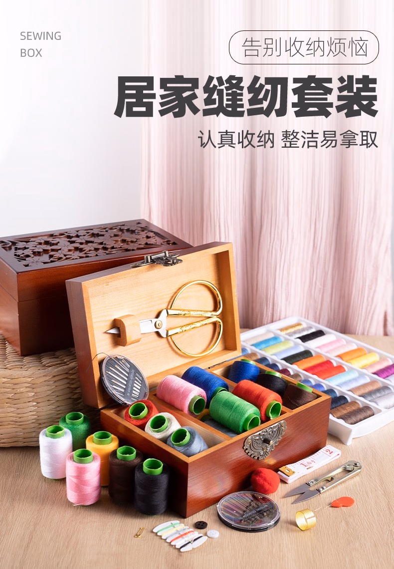 家用实木针线盒高档多功能结婚高质量大容量实用针线包收纳盒套装雕花实木针线盒套装(10色线)