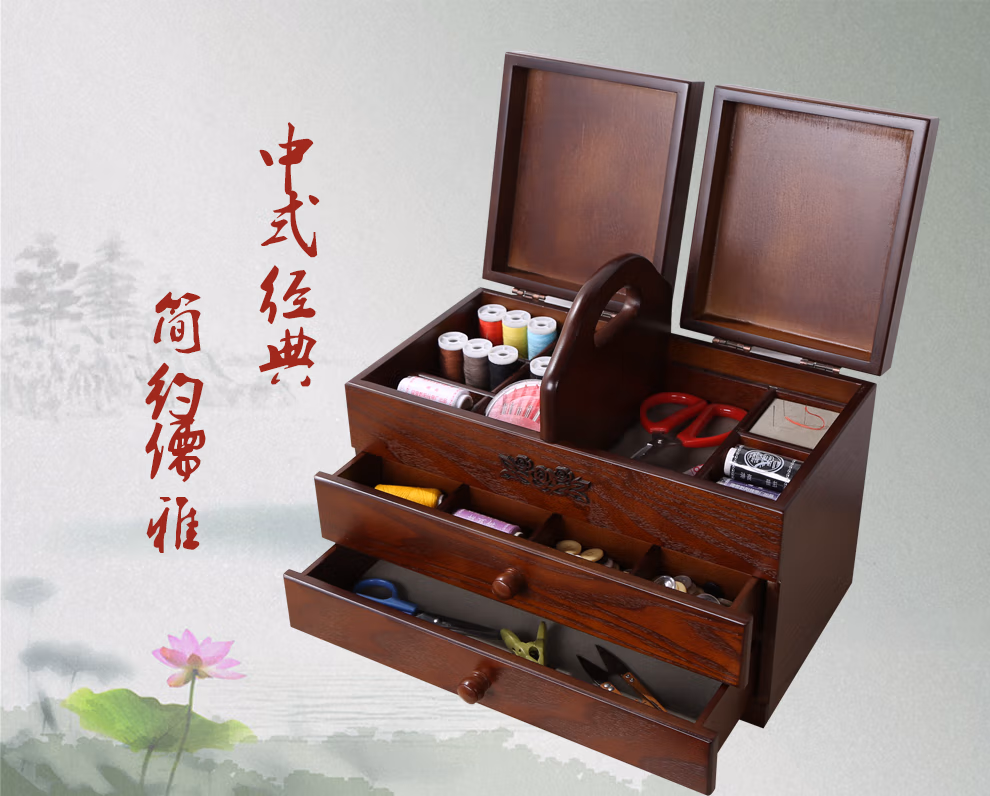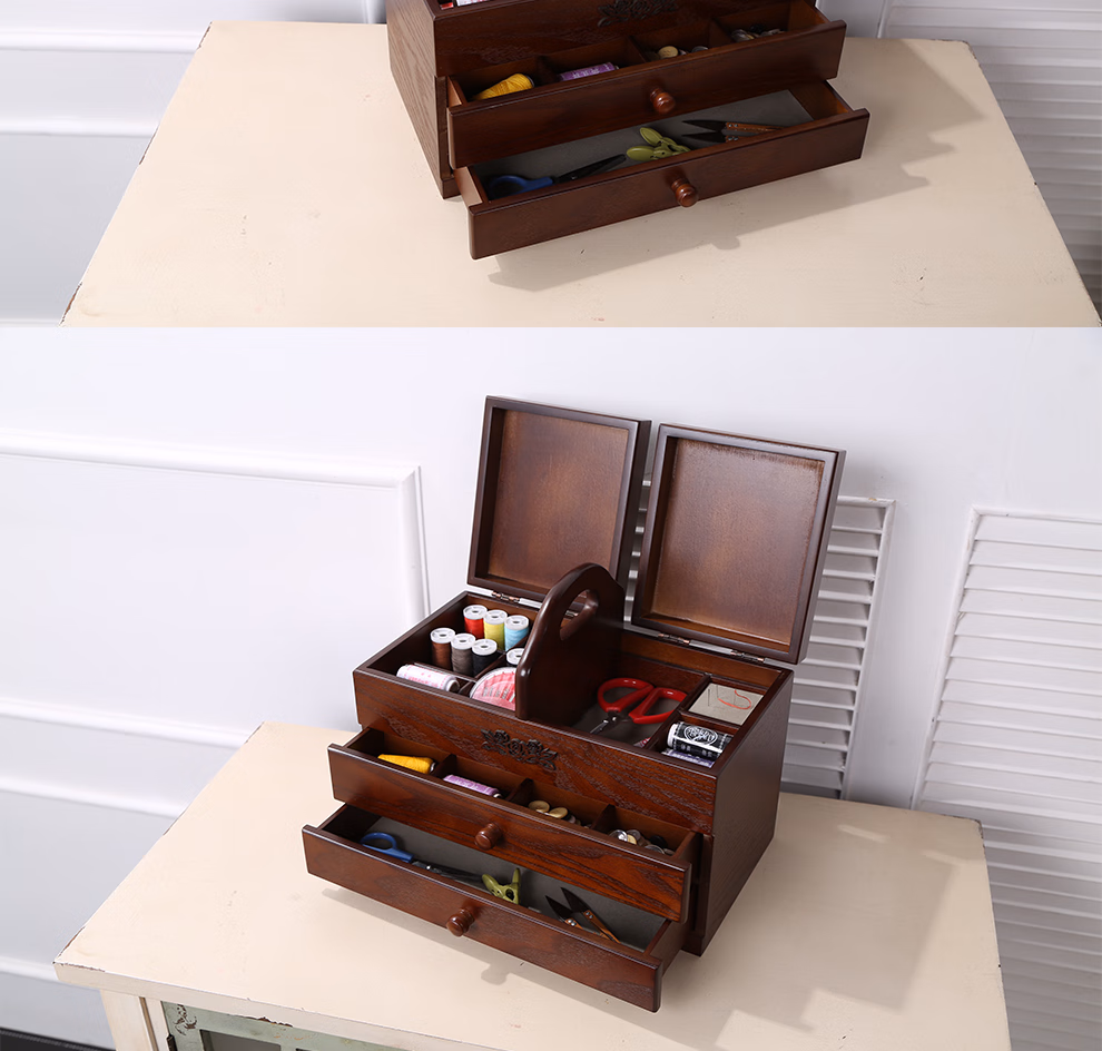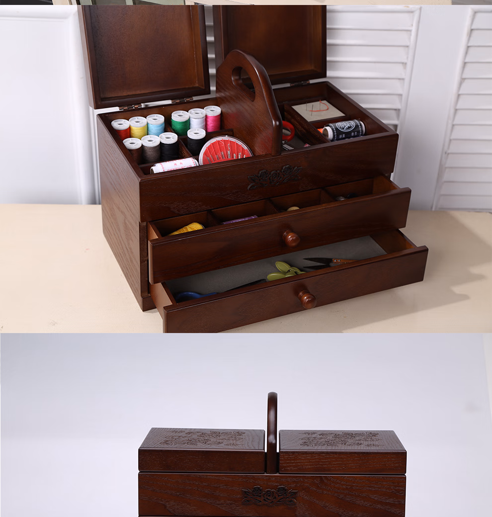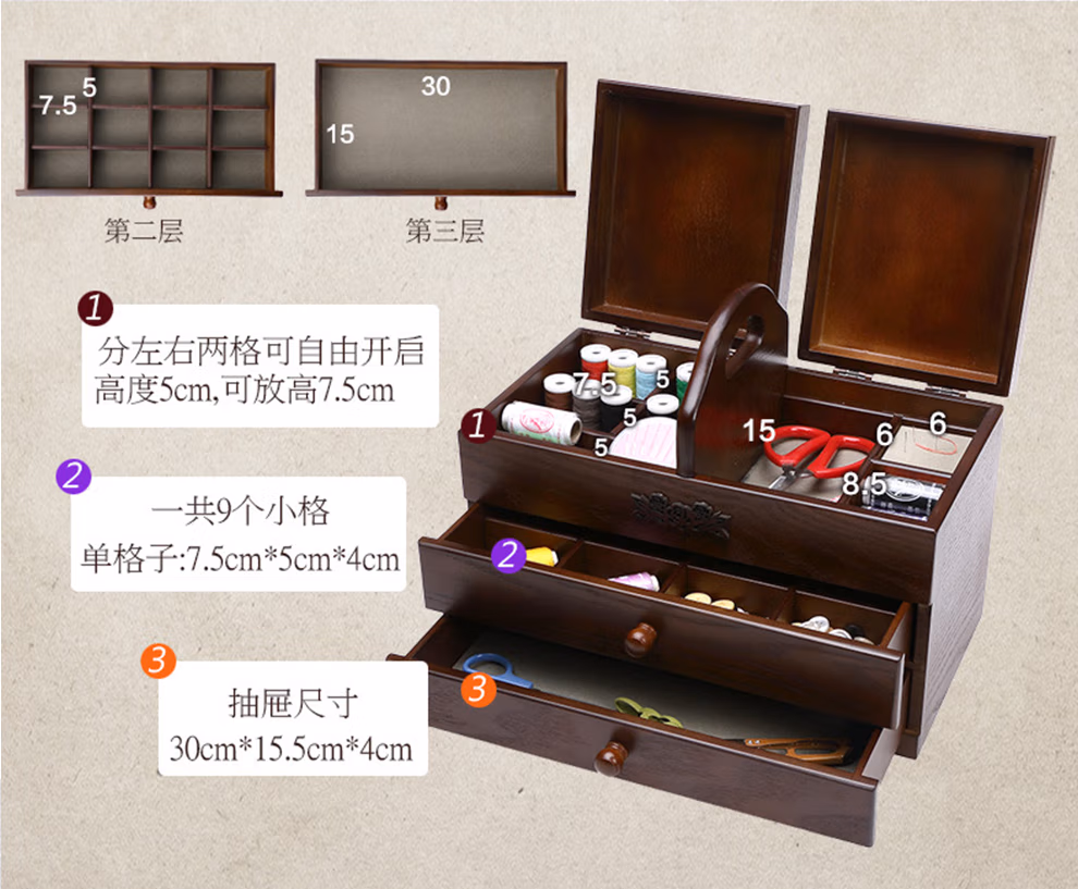 初心如雪针线盒木质复古大号化妆品收纳盒家用针线盒有盖梳妆台木制收纳盒大号三层针线盒