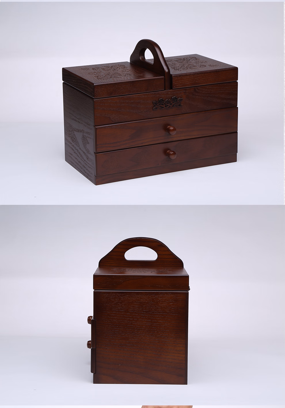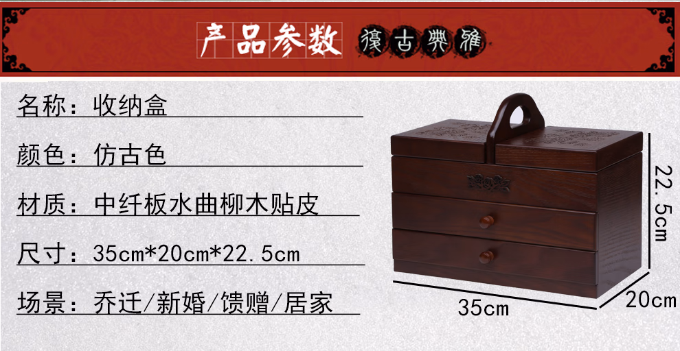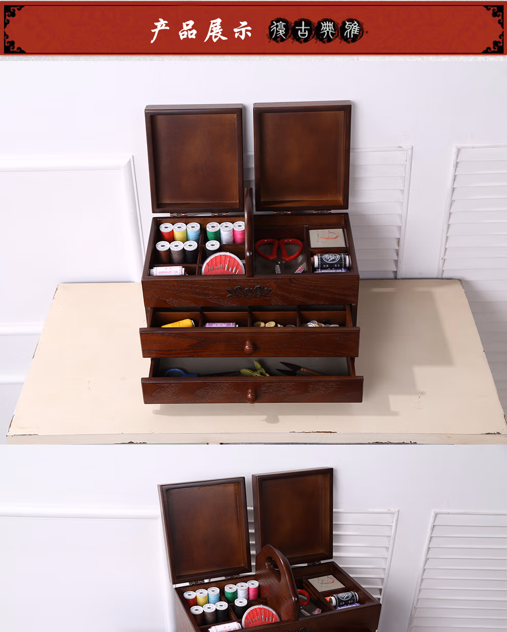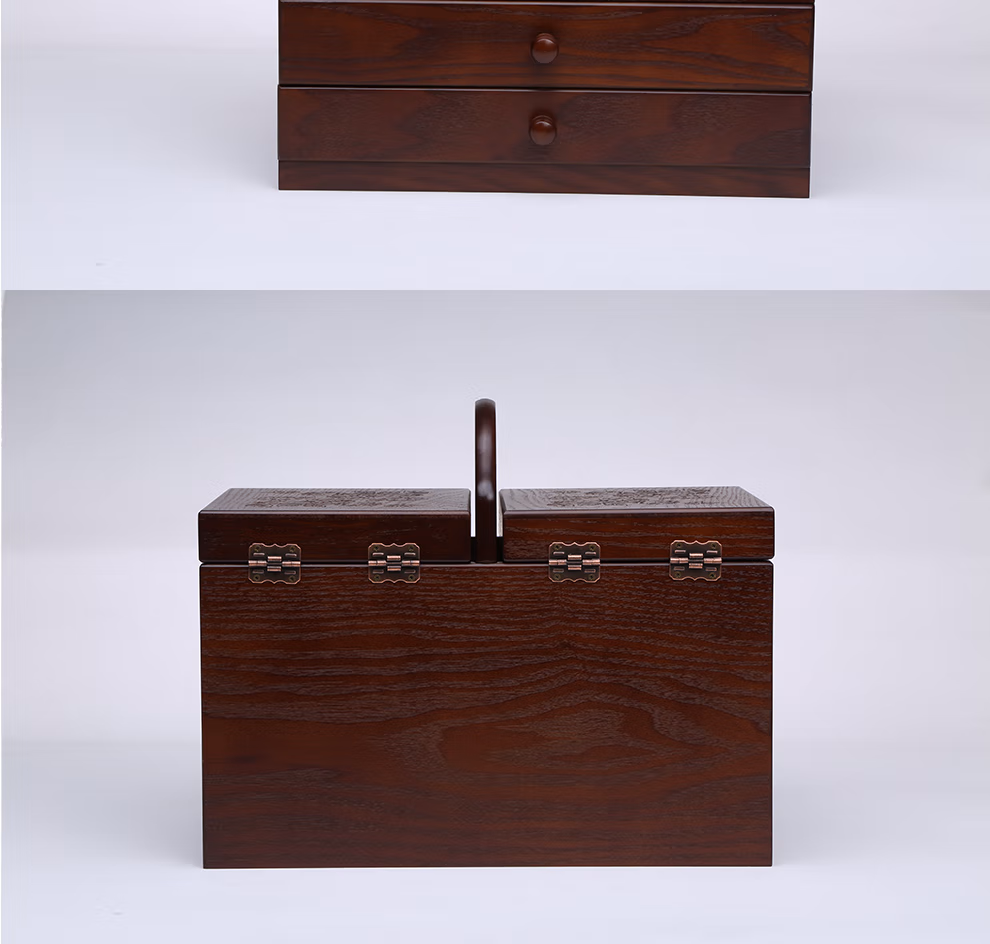 初心如雪针线盒木质复古大号化妆品收纳盒家用针线盒有盖梳妆台木制收纳盒大号三层针线盒