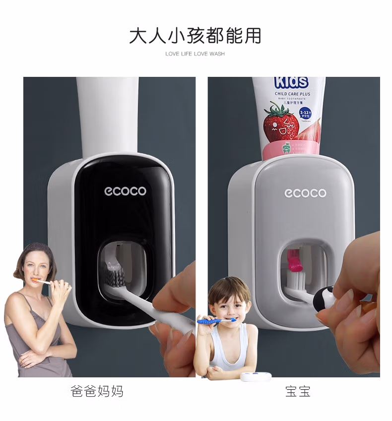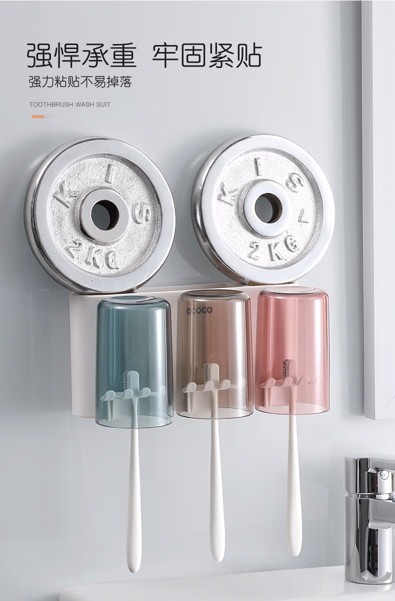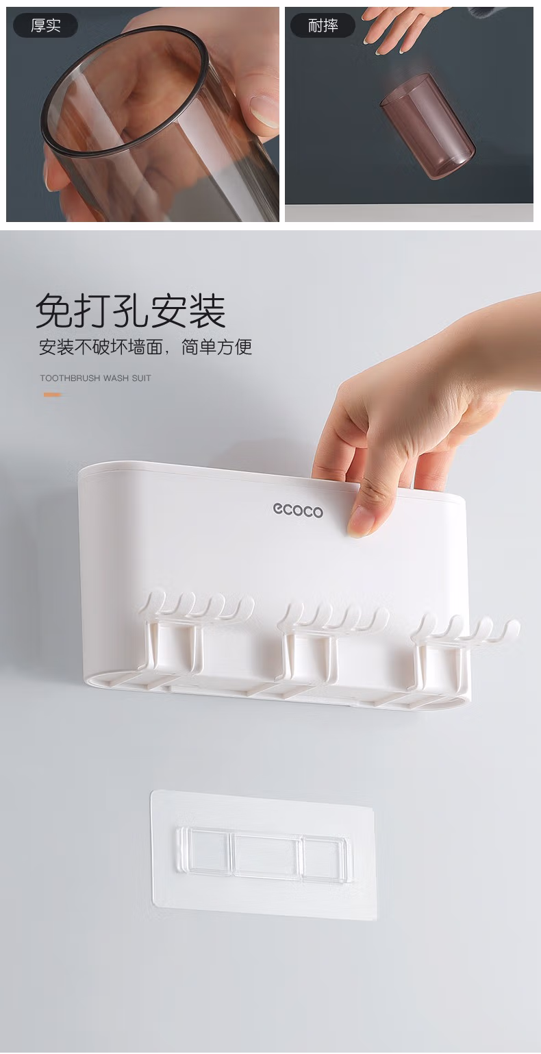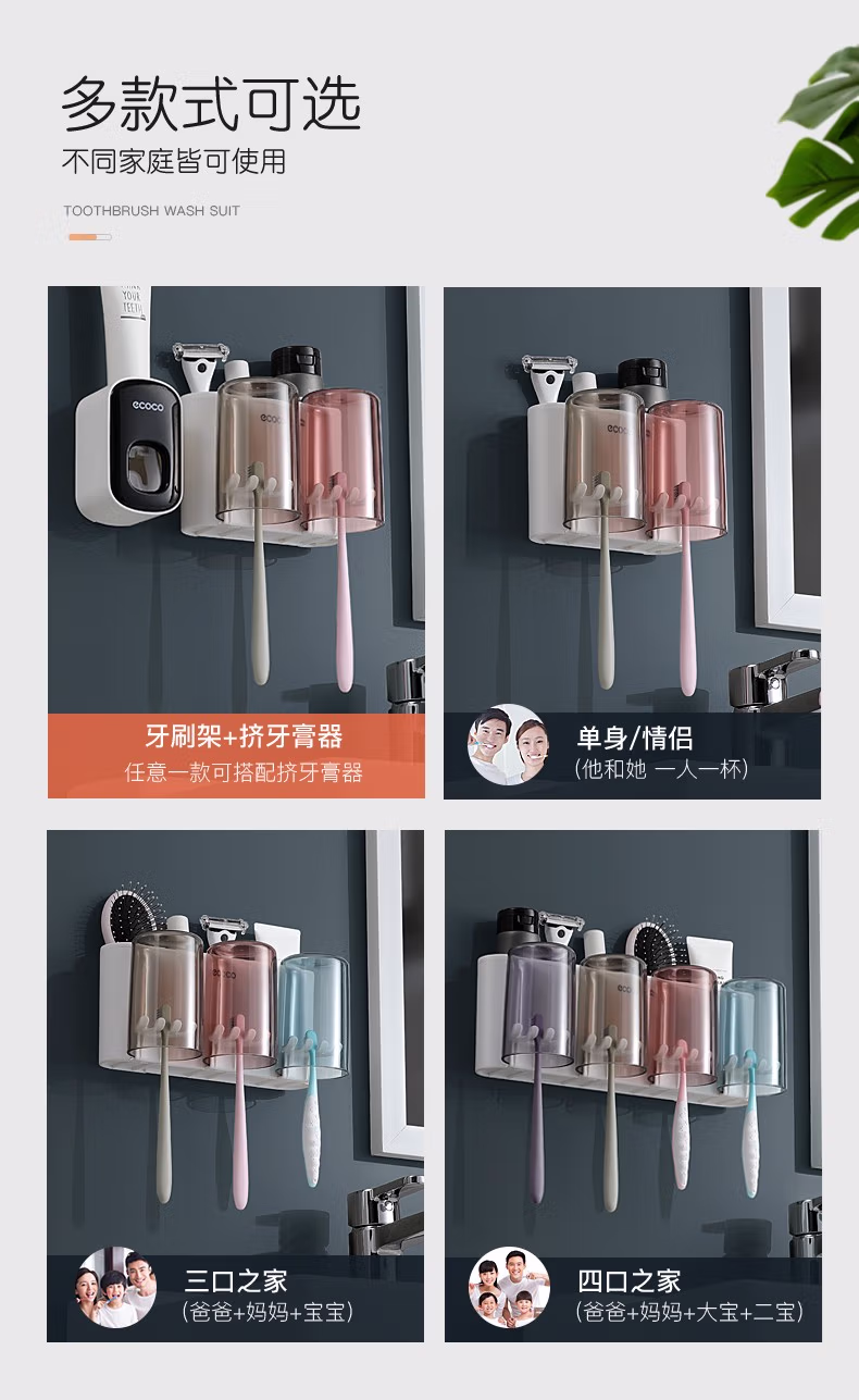 意可可(ecoco)吸盘牙刷架免打孔漱口杯卫生间壁挂式刷牙杯套装浴室洗漱置物架吸壁式牙缸洗漱用品幸福三杯 挤牙膏器(黑色)