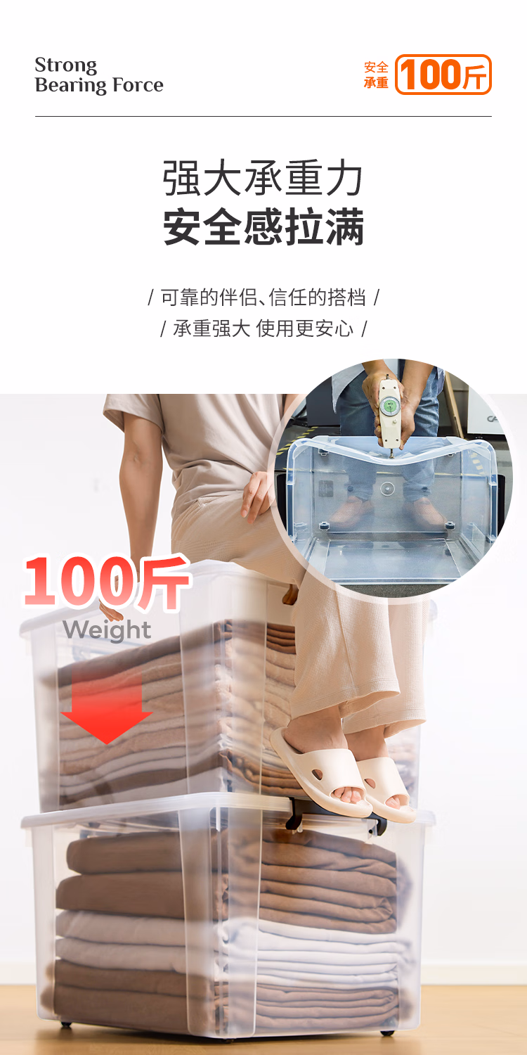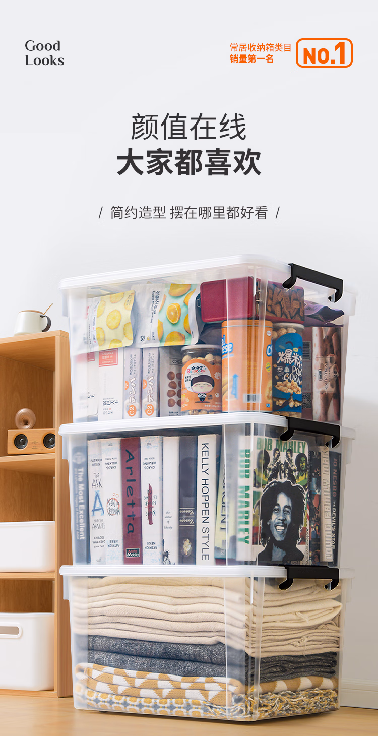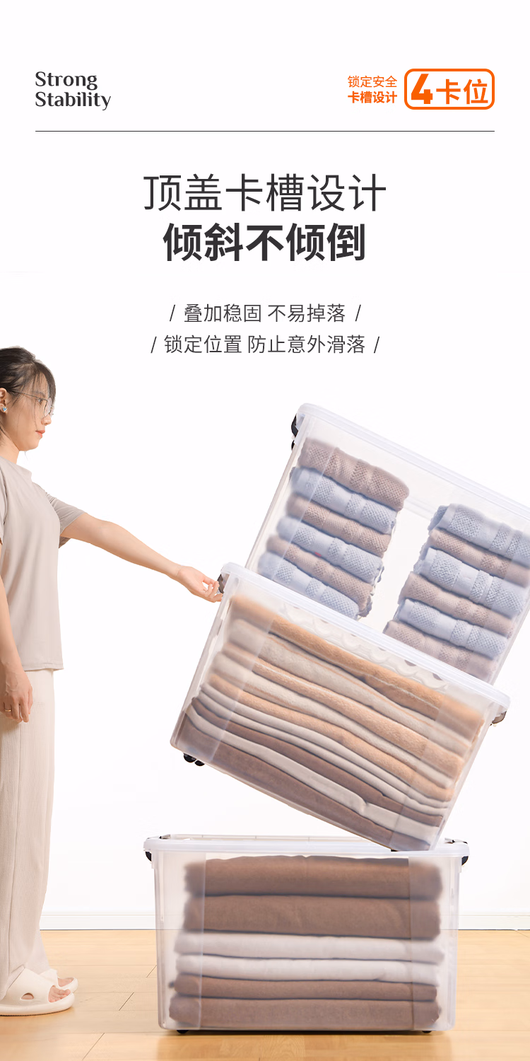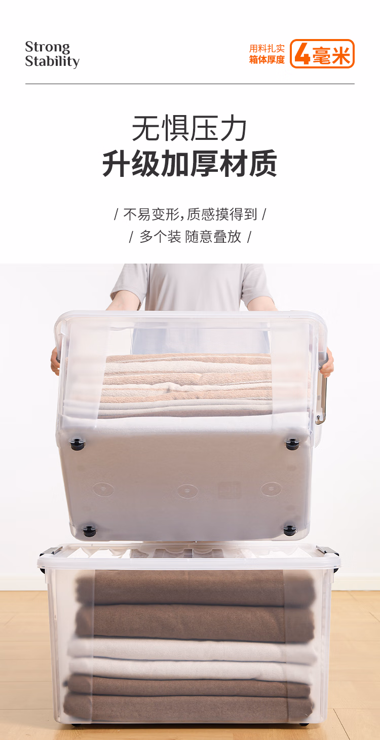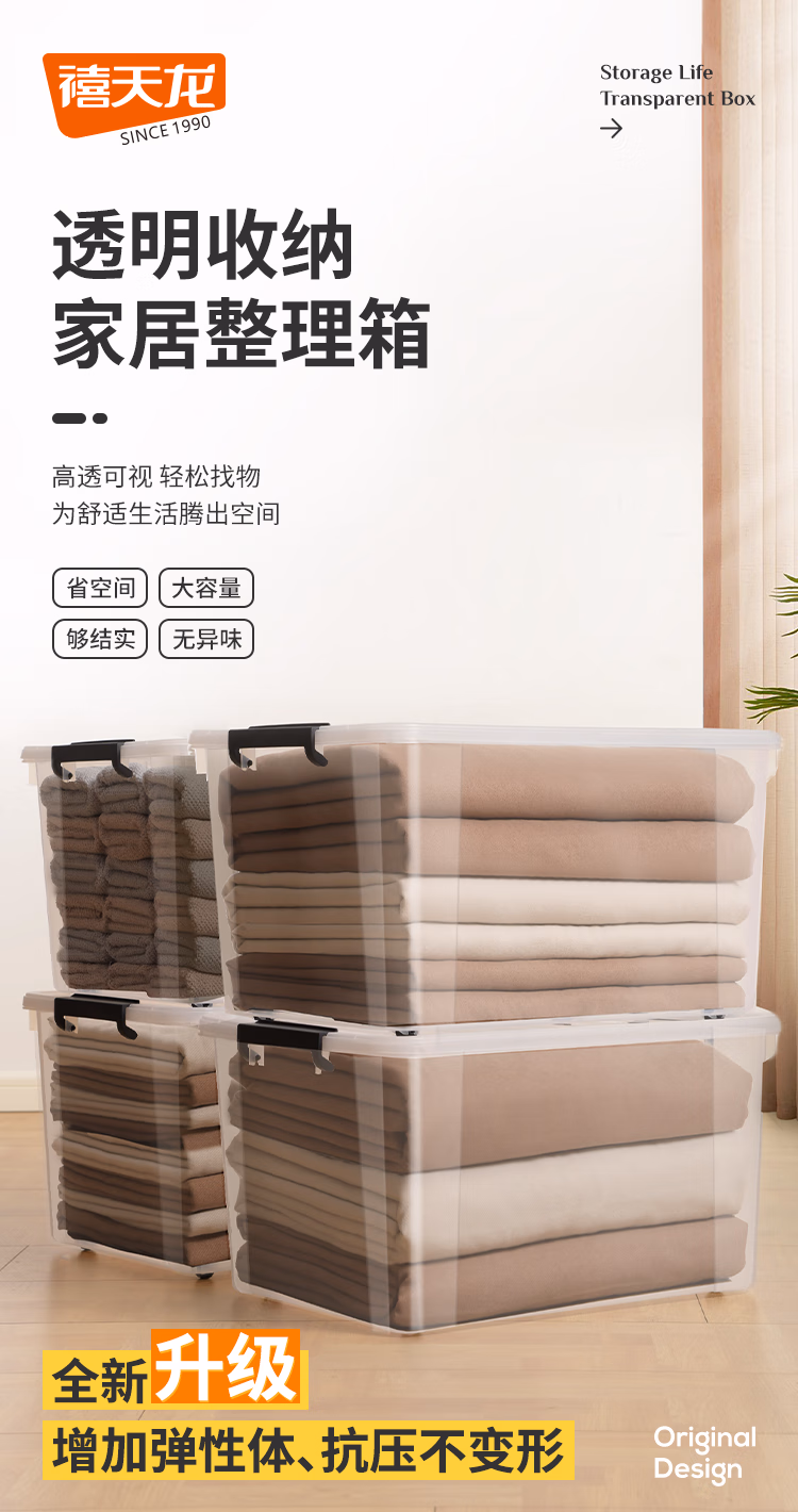 禧天龙加厚衣服收纳箱大号55升3个装 儿童玩具整理箱 搬家箱打包箱 透明储物箱带轮