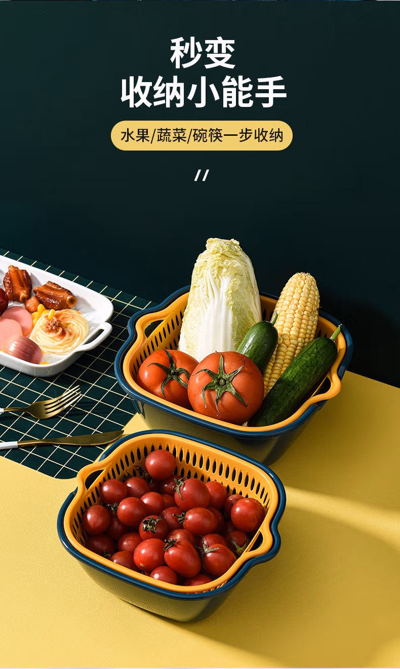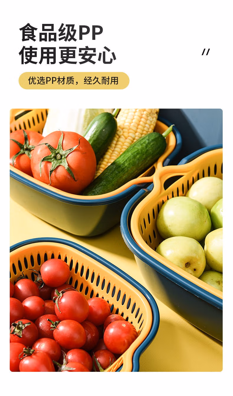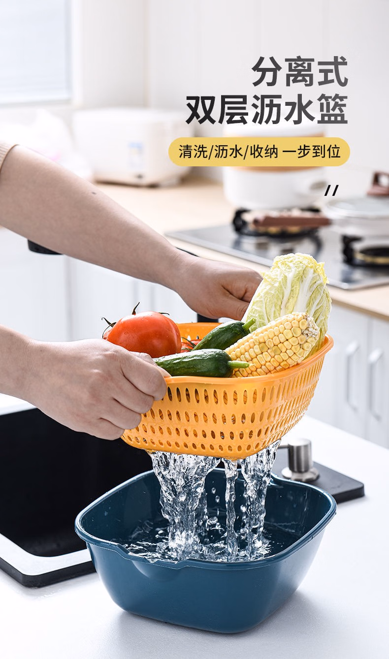 铁群岛6件套双层沥水篮3个洗菜盆厨房沥水神器家用多功能漏水篮水果篮子 双层洗菜篮小号 中号 大号(3个6件套)-颜色混搭