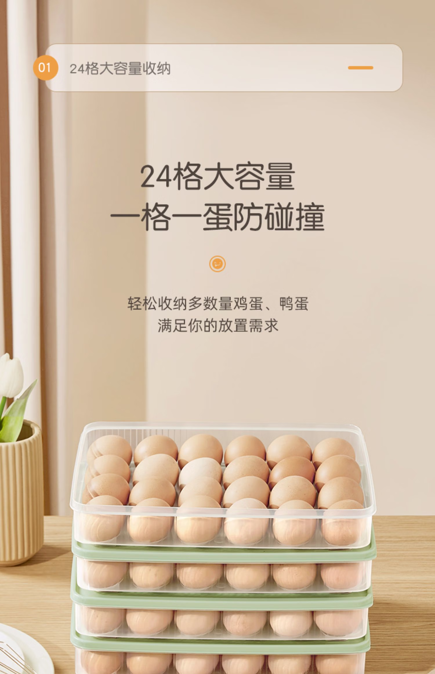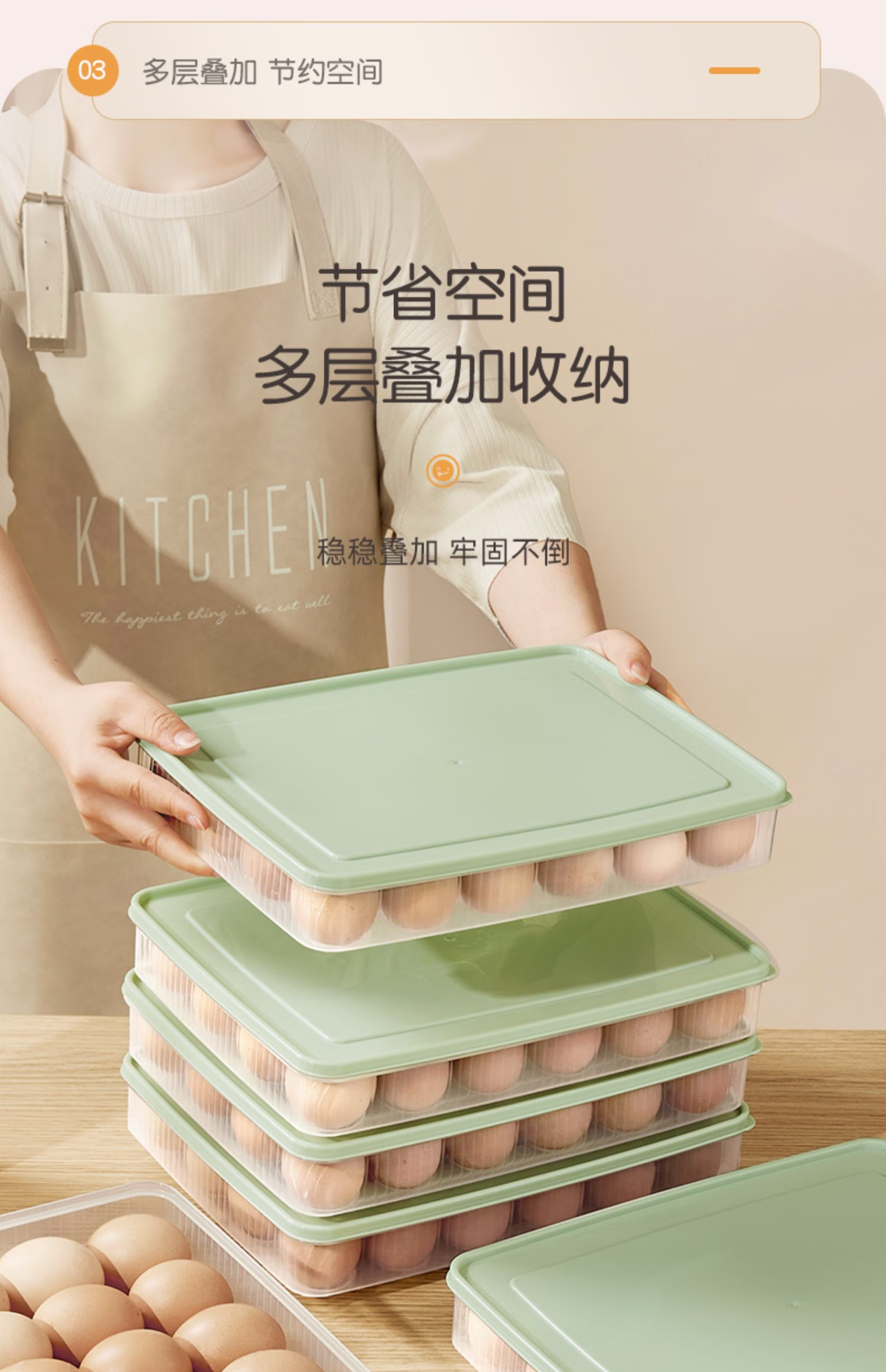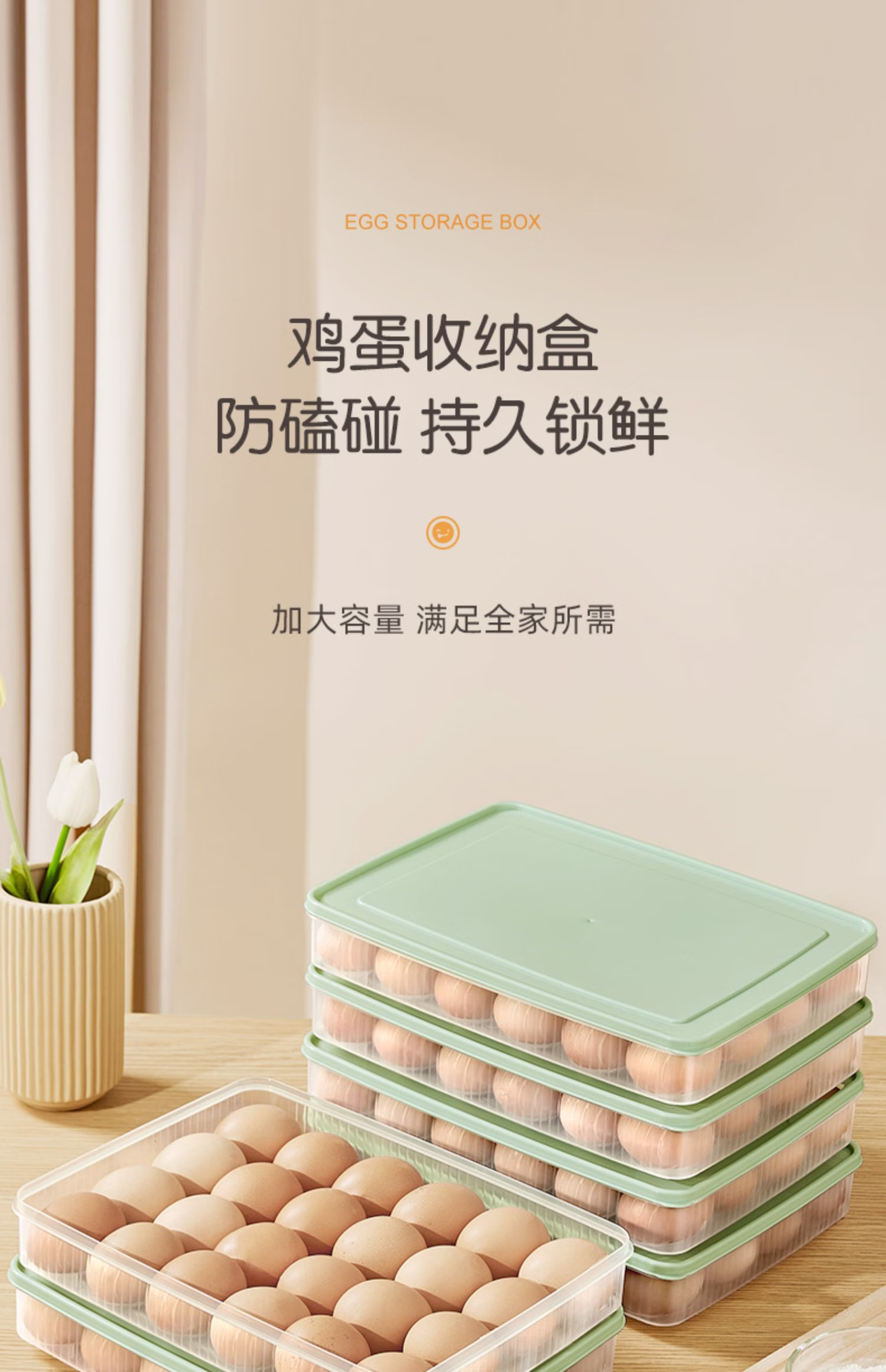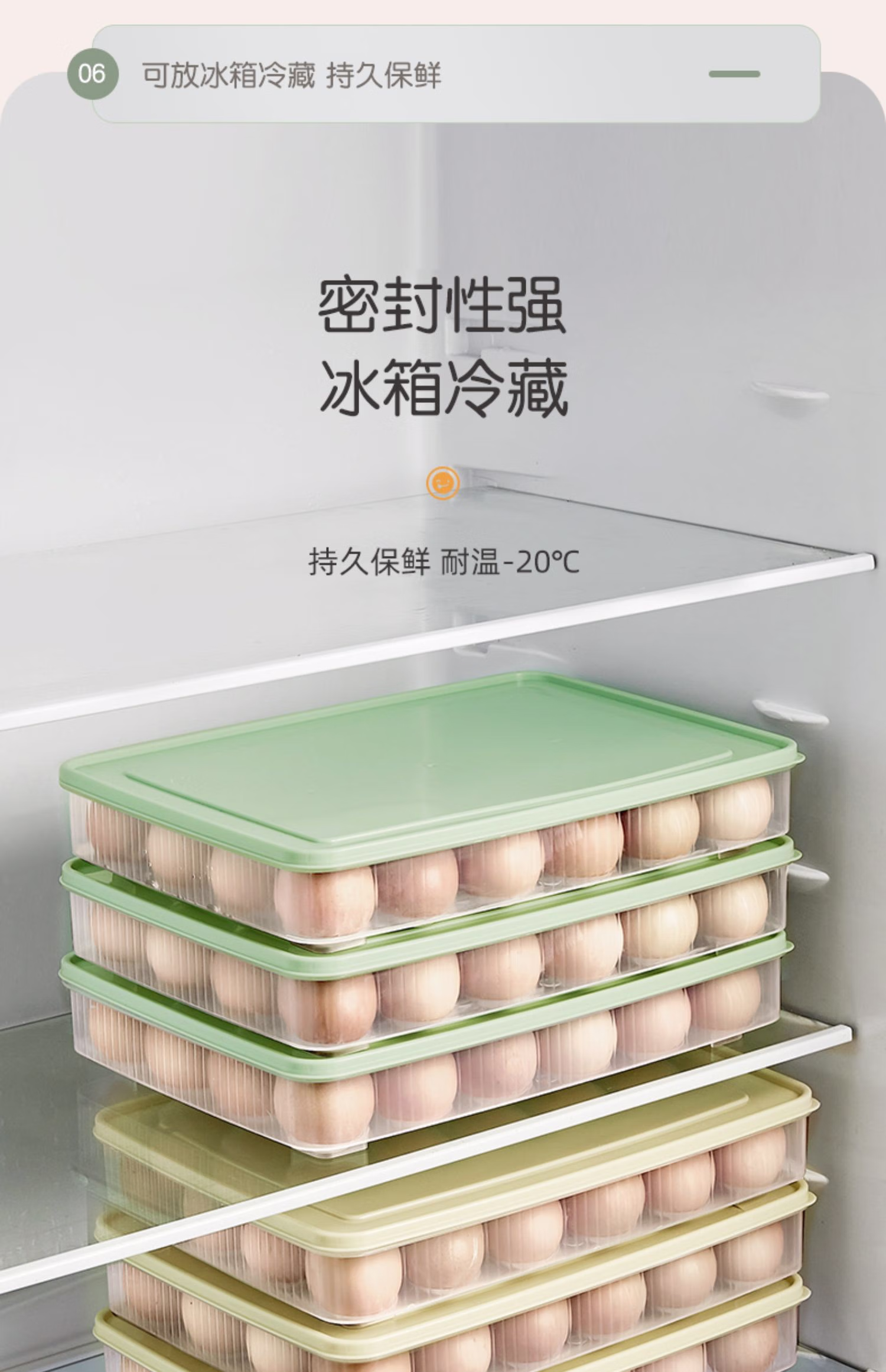 卡维瑞鸡蛋收纳盒冰箱食品级密封保鲜盒家用厨房防震可叠加鸡蛋托架 带盖储物盒浅绿色【一层24个装 】