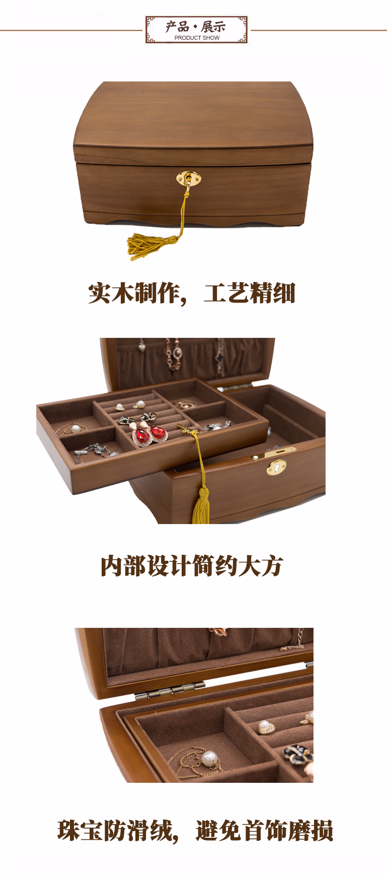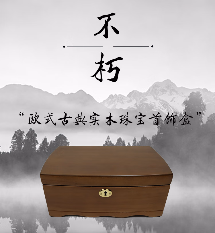 首饰盒实木带锁欧式精致高档复古木质首饰品收纳盒手表盒胖景品首饰盒【优质松木】