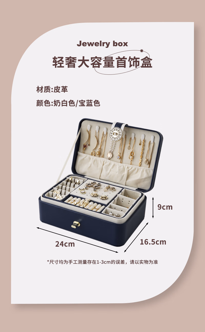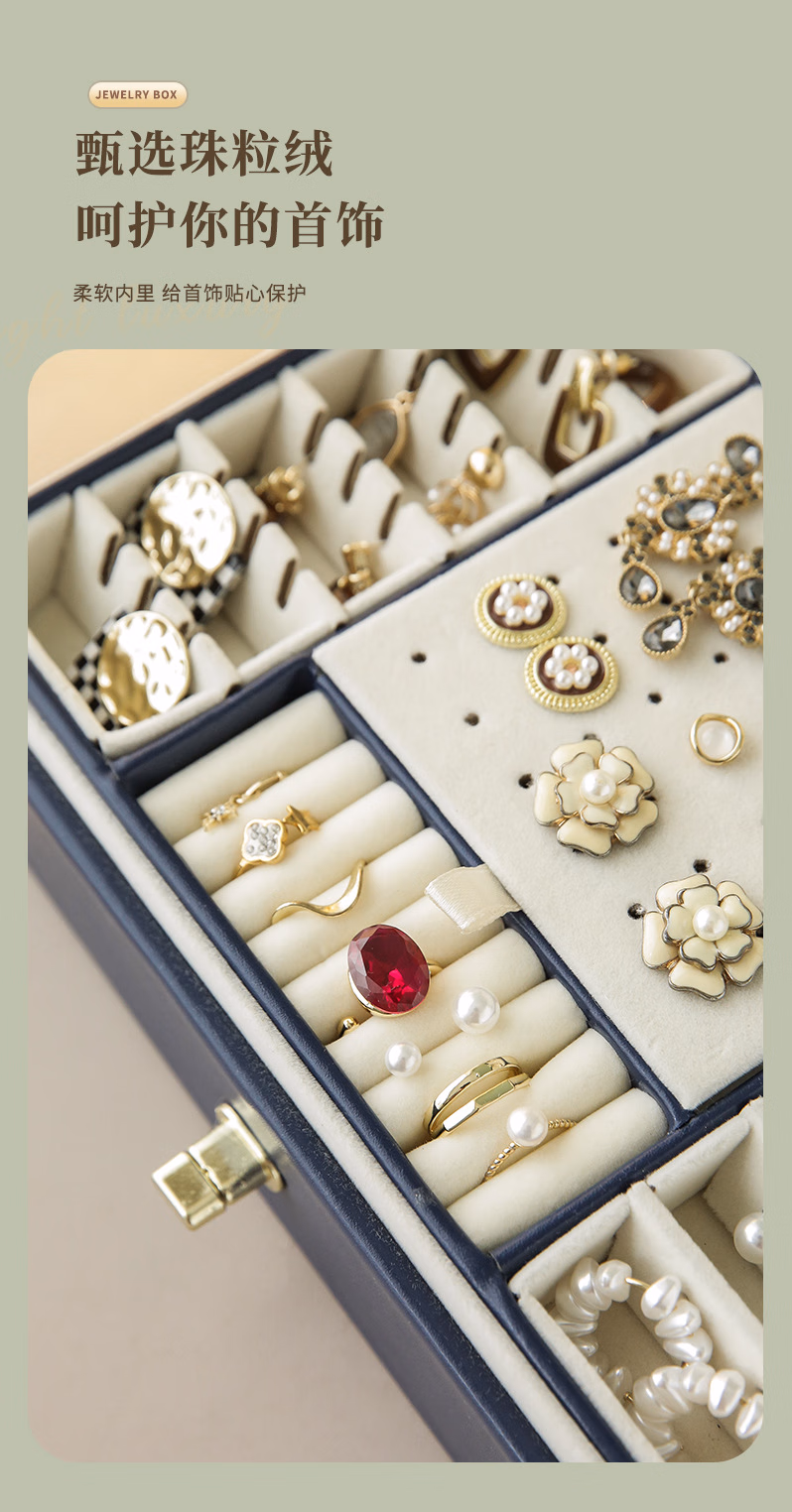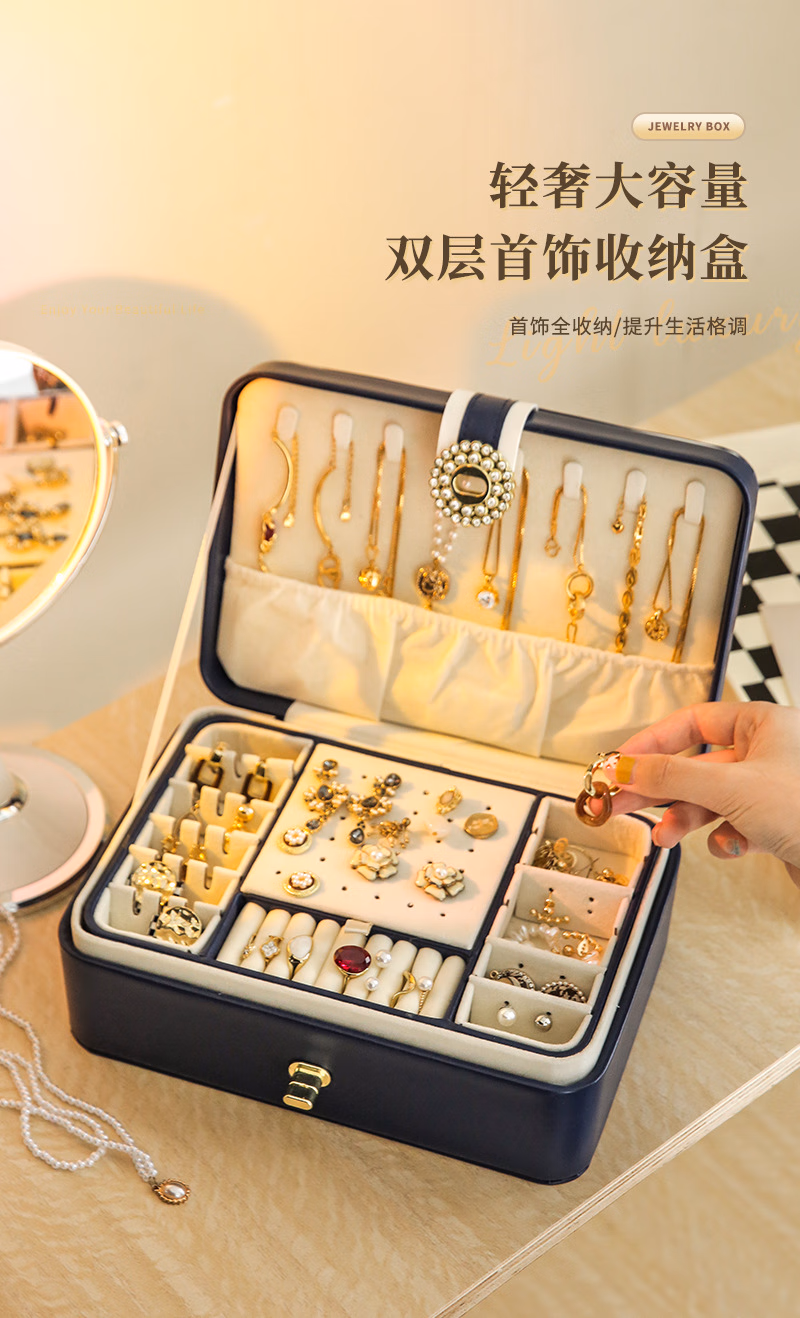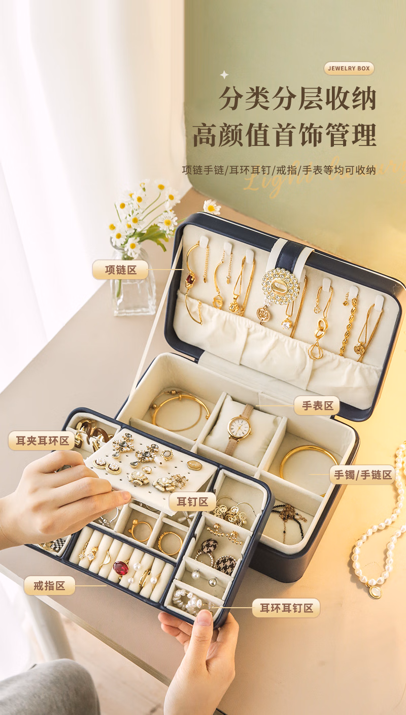 首饰盒收纳盒手饰品盒桌面精致大容量收拾项链耳环手表手链高档珠宝盒订婚婚礼女生生日礼物送女友轻奢款蓝色