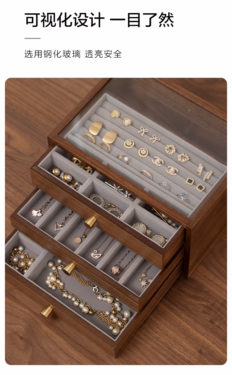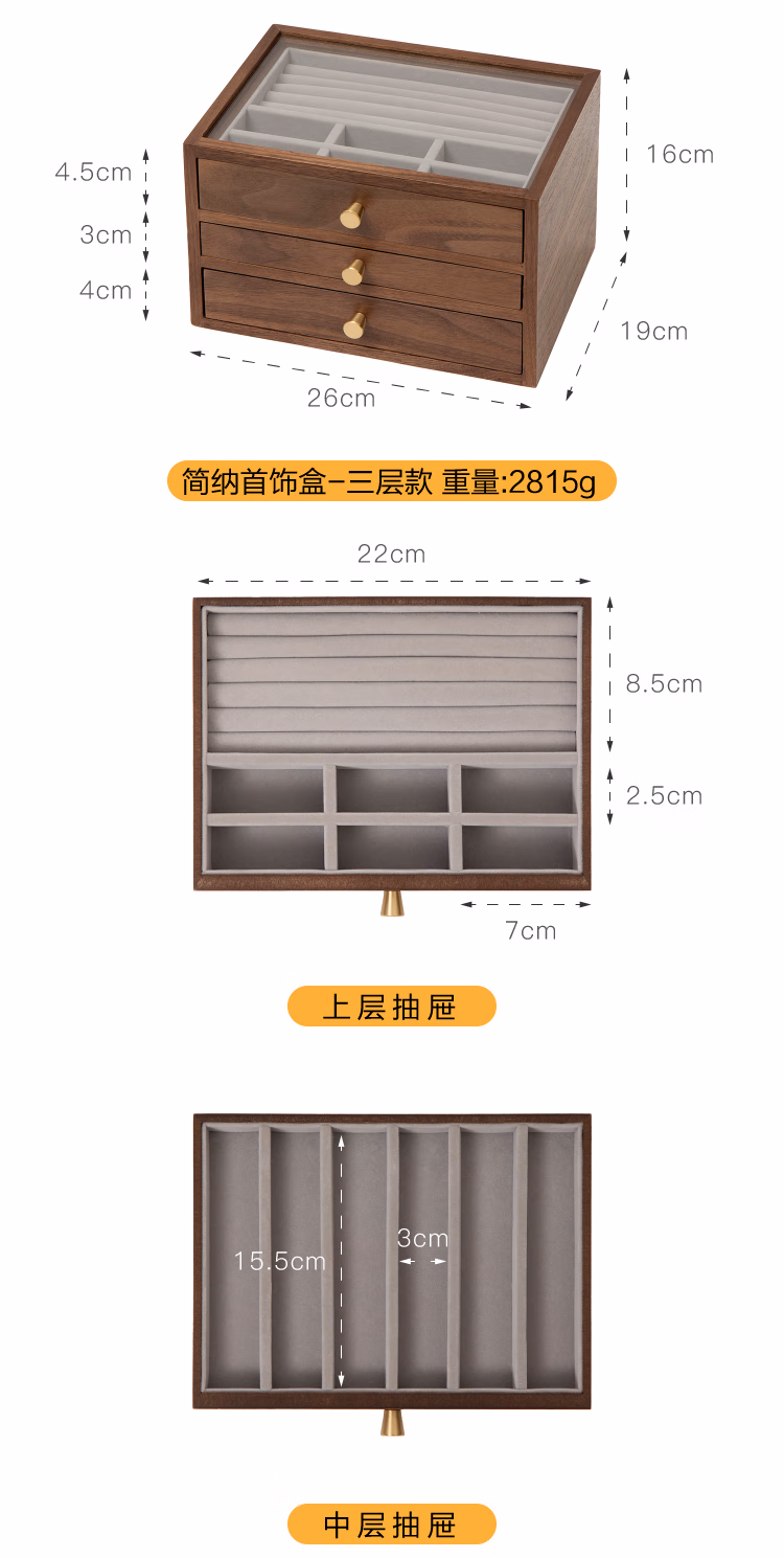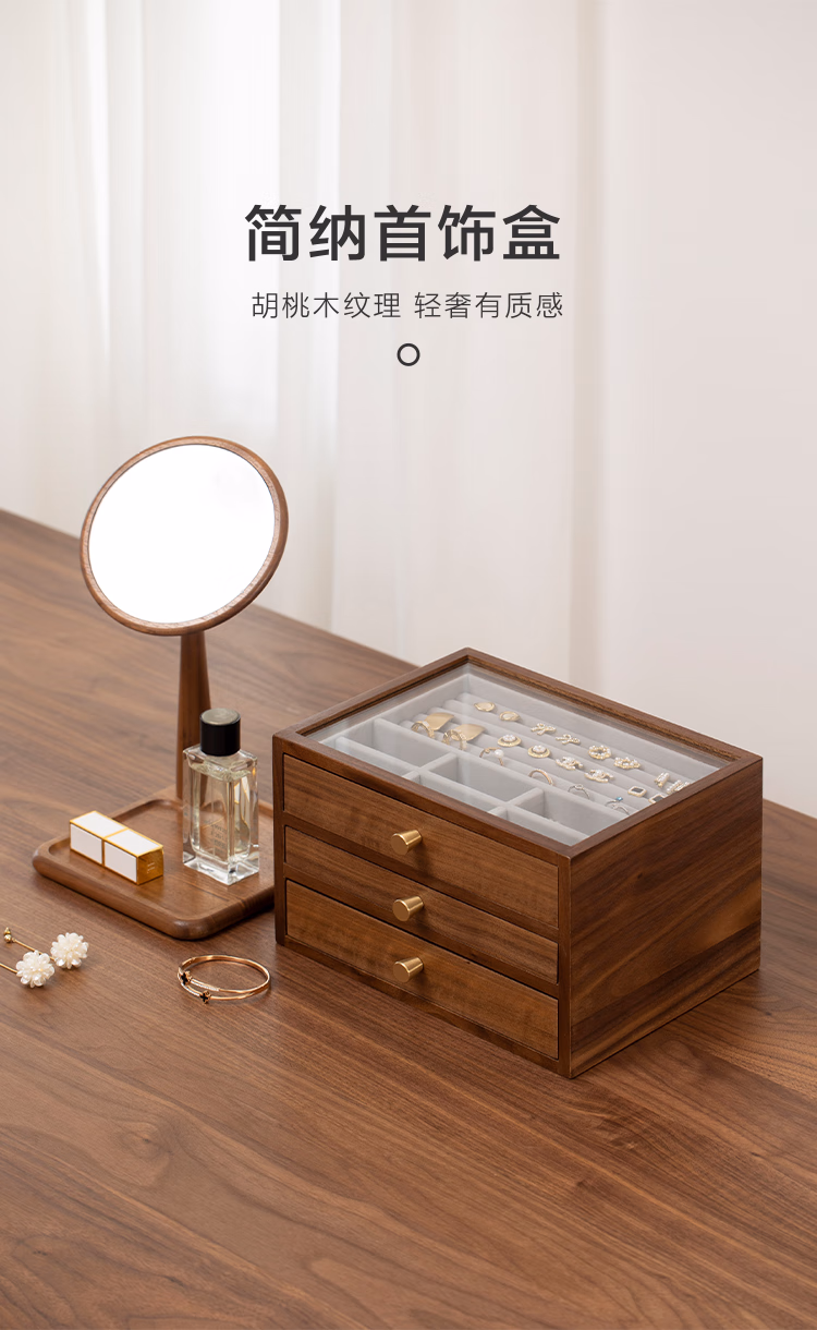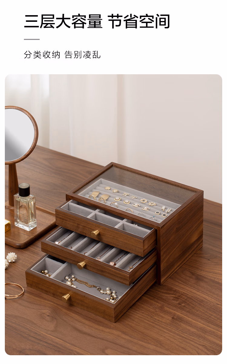 梵瀚(FANHAN)木质多层首饰收纳盒高级感桌面手饰品盒大容量金银结婚珠宝盒 简纳首饰盒-三层款