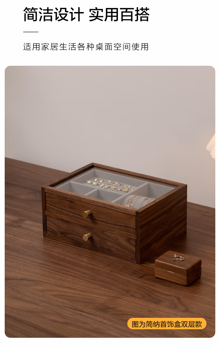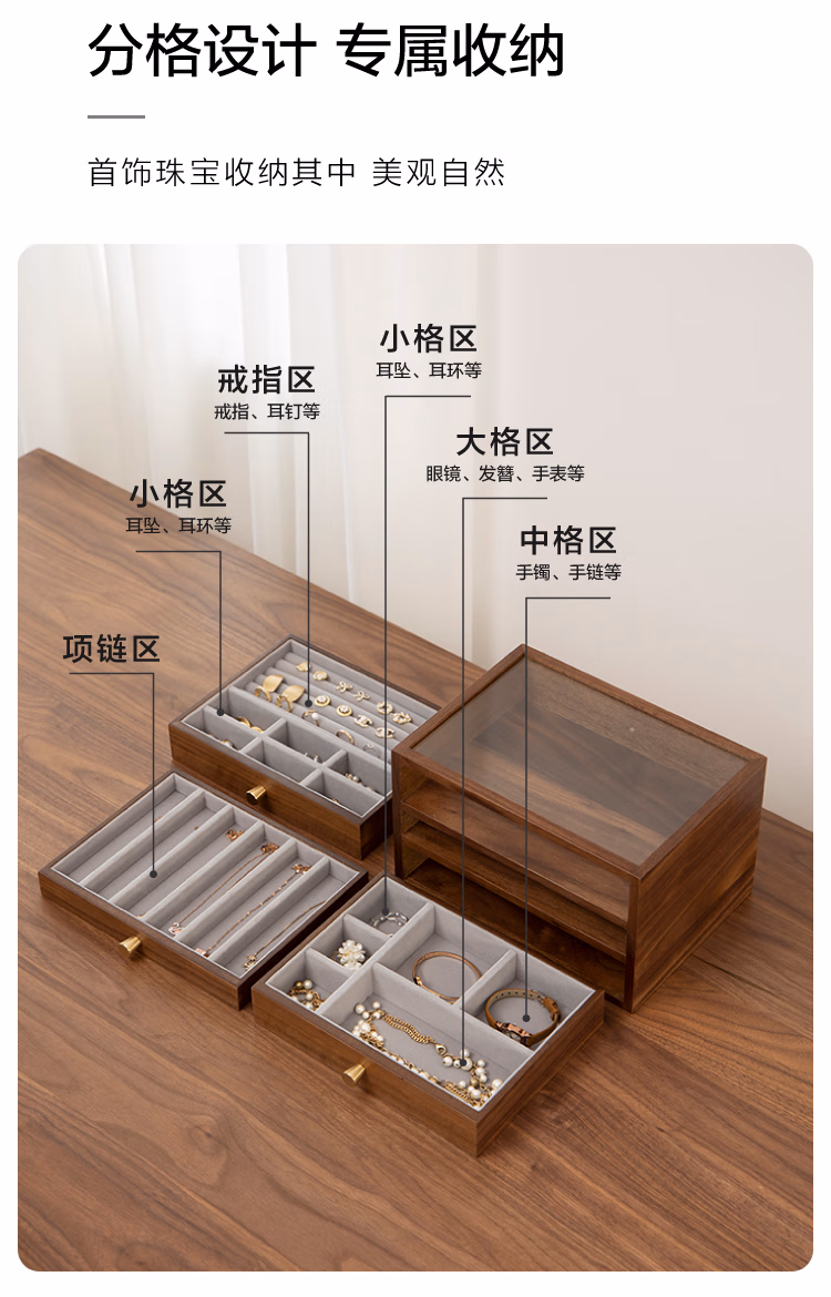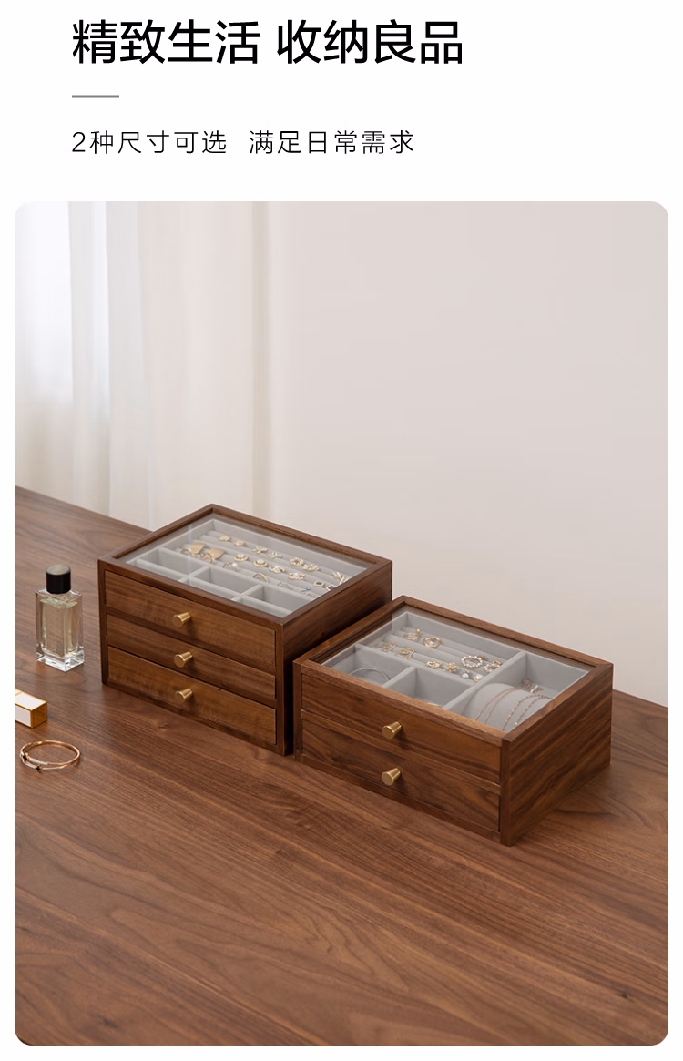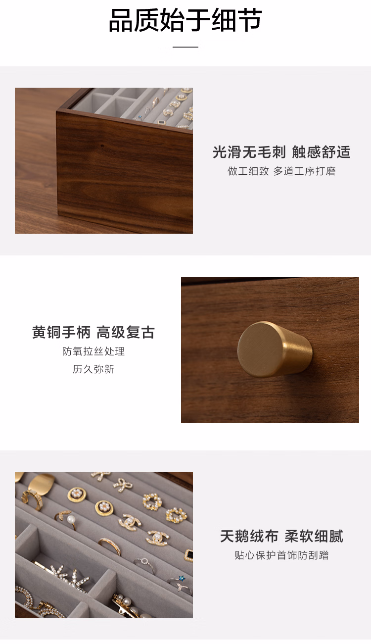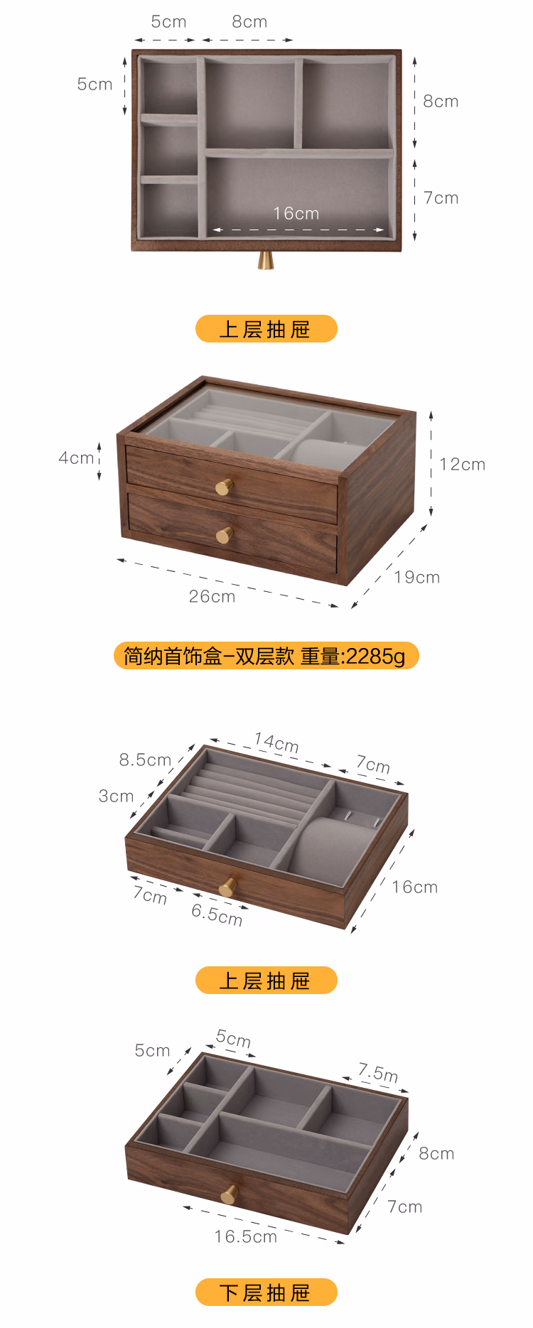 梵瀚(FANHAN)木质多层首饰收纳盒高级感桌面手饰品盒大容量金银结婚珠宝盒 简纳首饰盒-三层款
