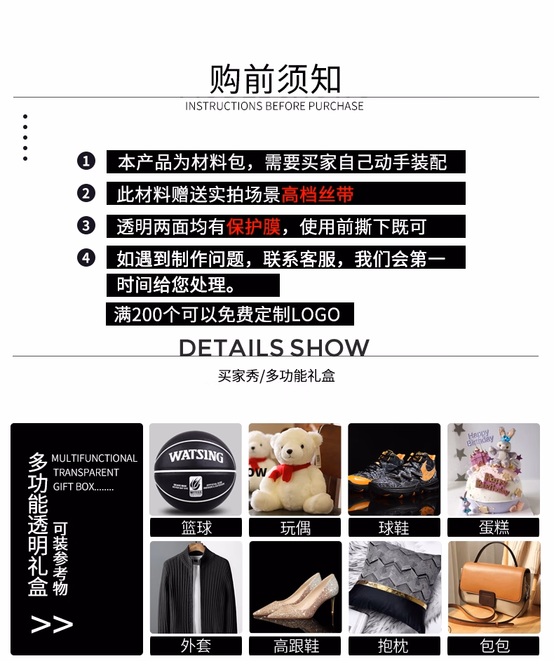 篮球礼盒空盒0a透明装鞋篮球礼盒包装盒子空盒生日礼物盒礼品盒送男女大号ins8寸超高款(26*26*30高)透明 礼盒 原图丝带 贺卡