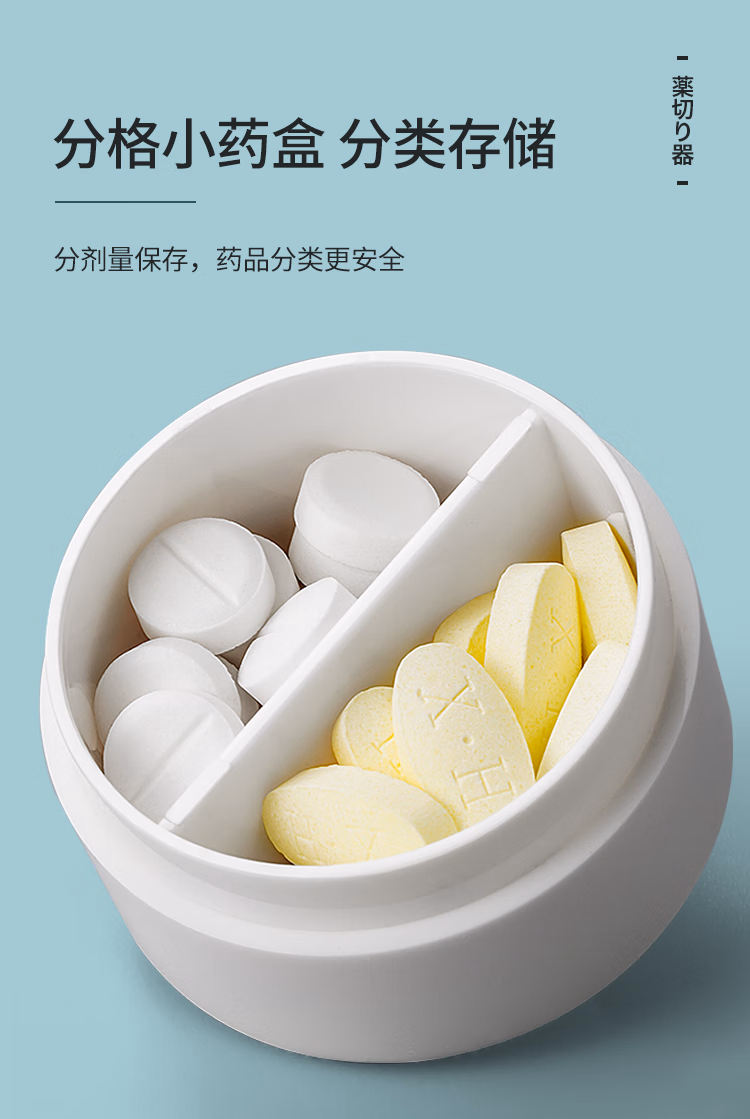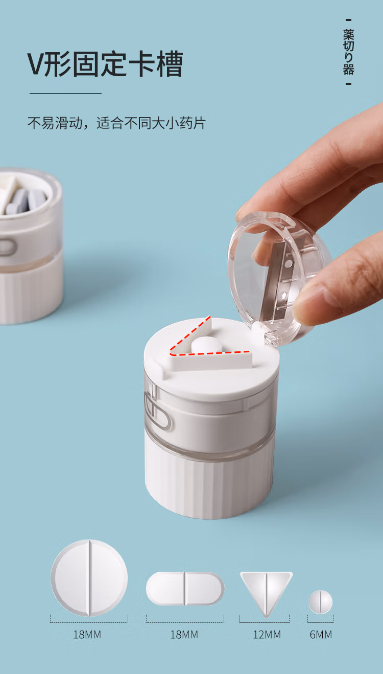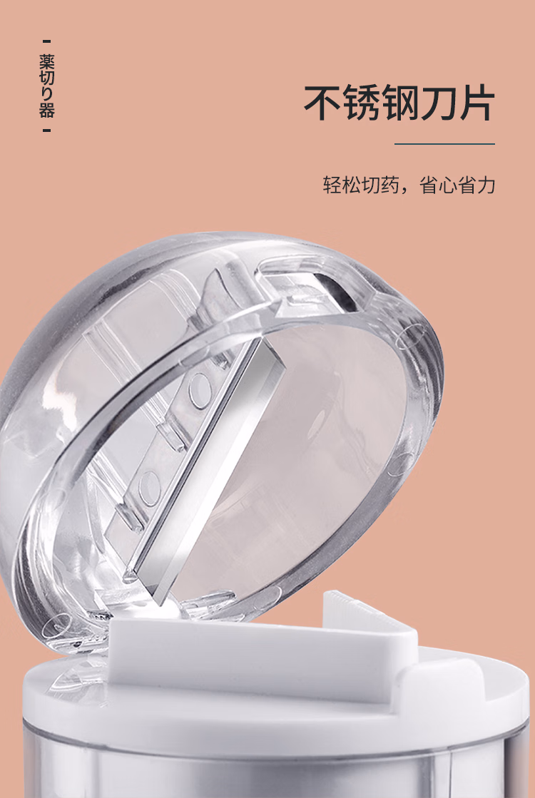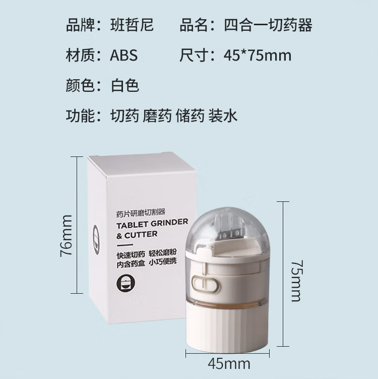 班哲尼切药器一分四可固定药片分药器四八分一分二研磨器收纳盒切药盒磨粉便携切割小药片分装药盒 圆柱白色