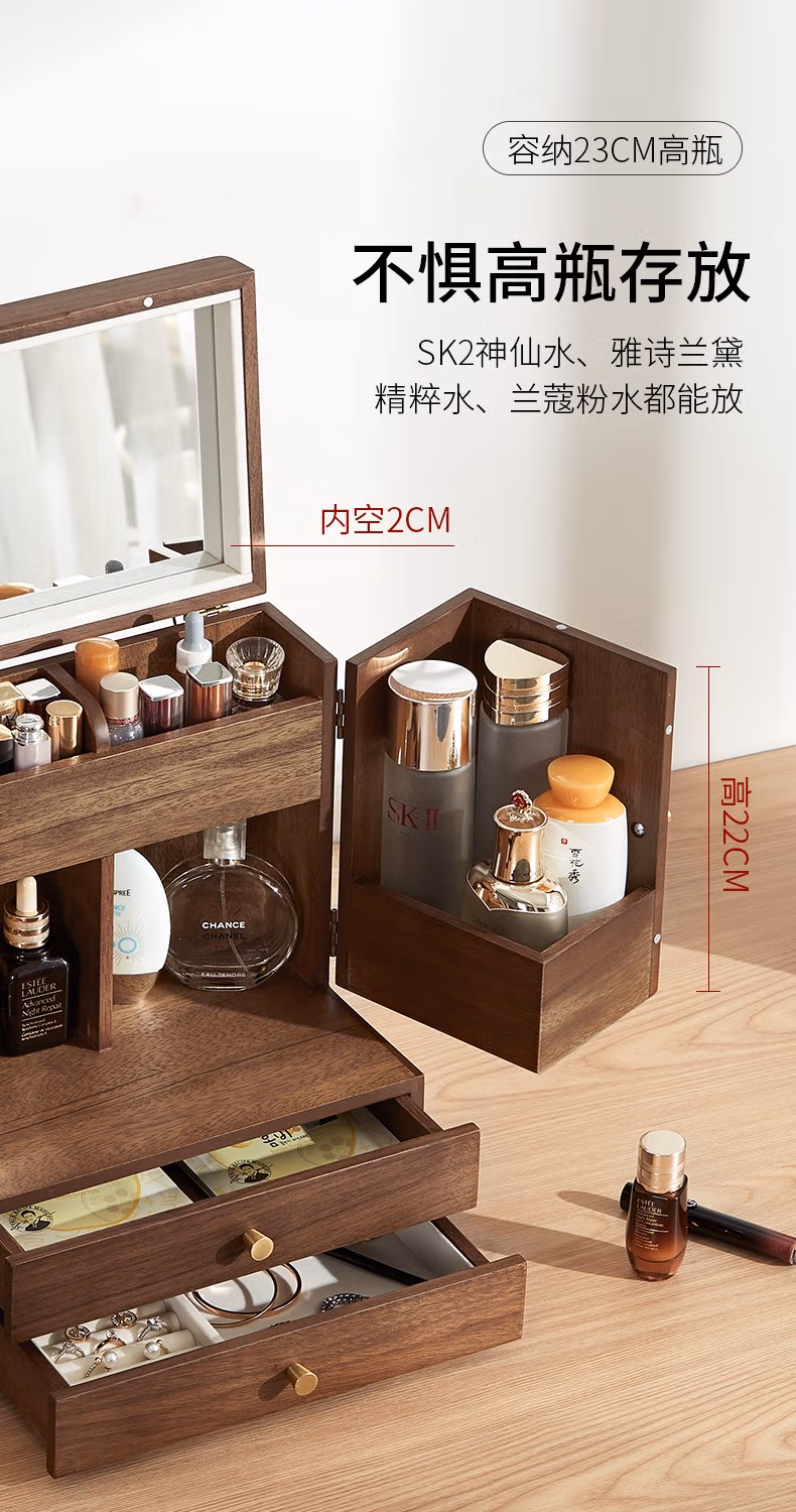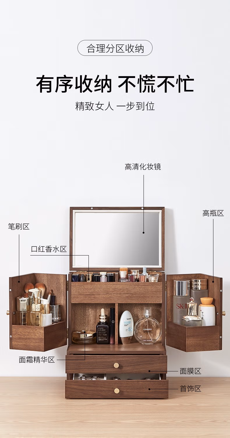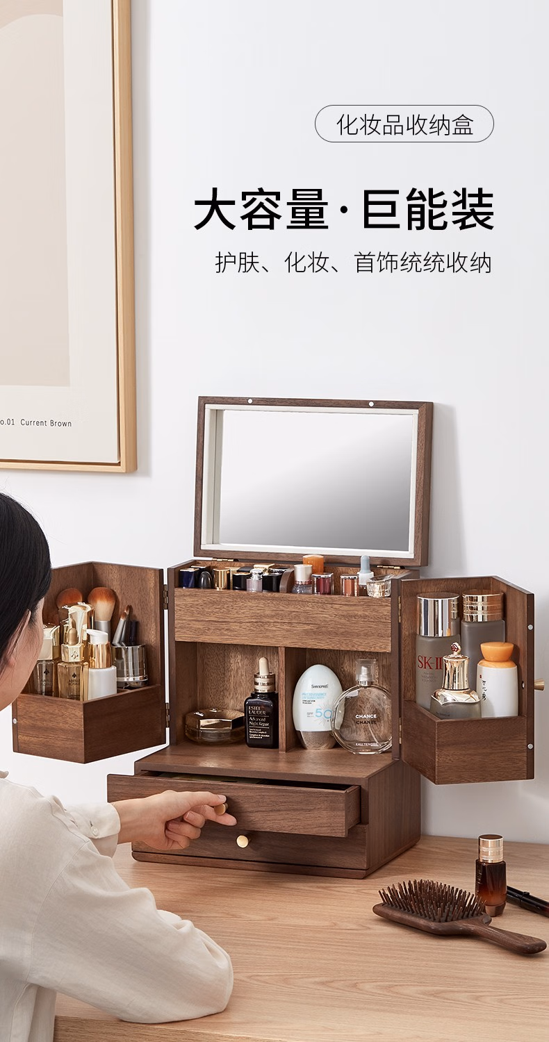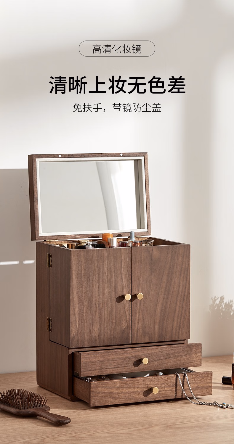 初心(CHOSIN)化妆品收纳盒带镜子生日礼物送女生桌面收纳护肤品口红妆台珠宝首饰盒化妆箱 方形化妆品收纳盒-胡桃木色