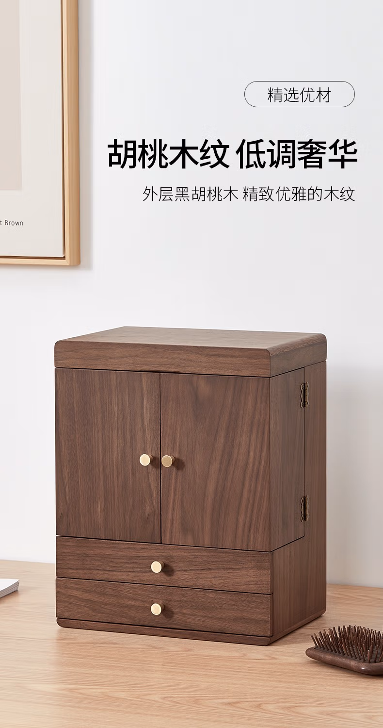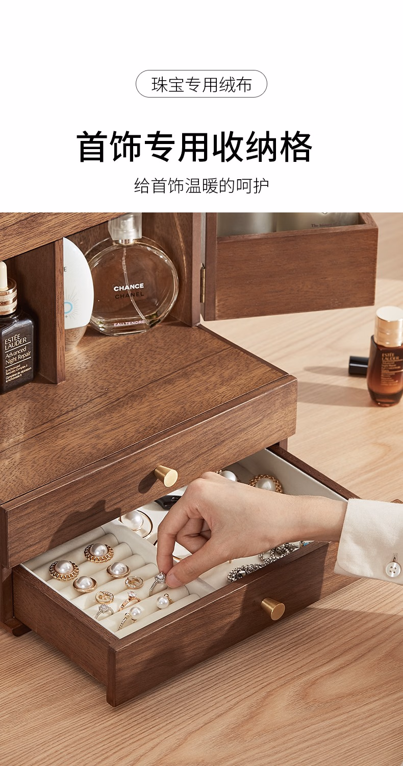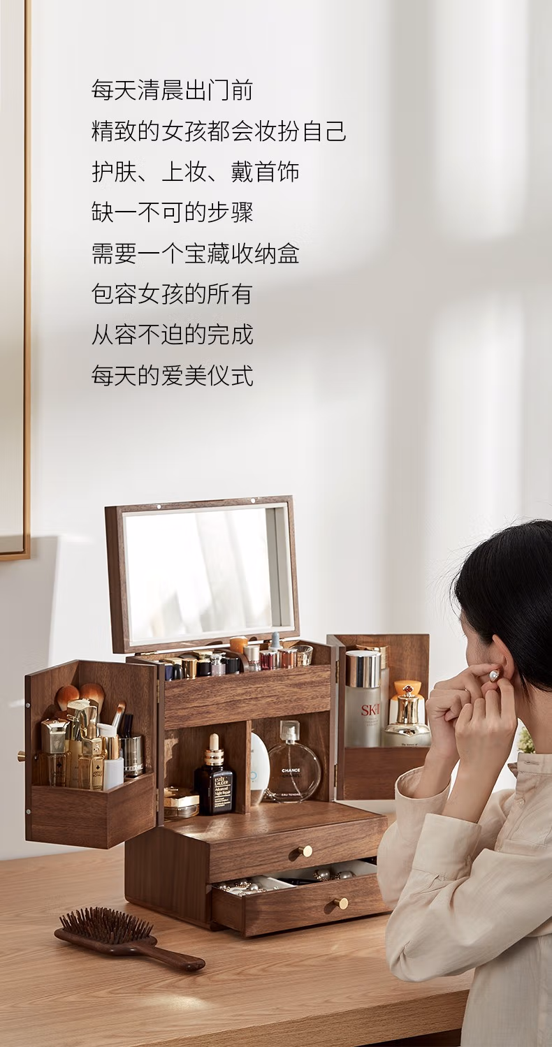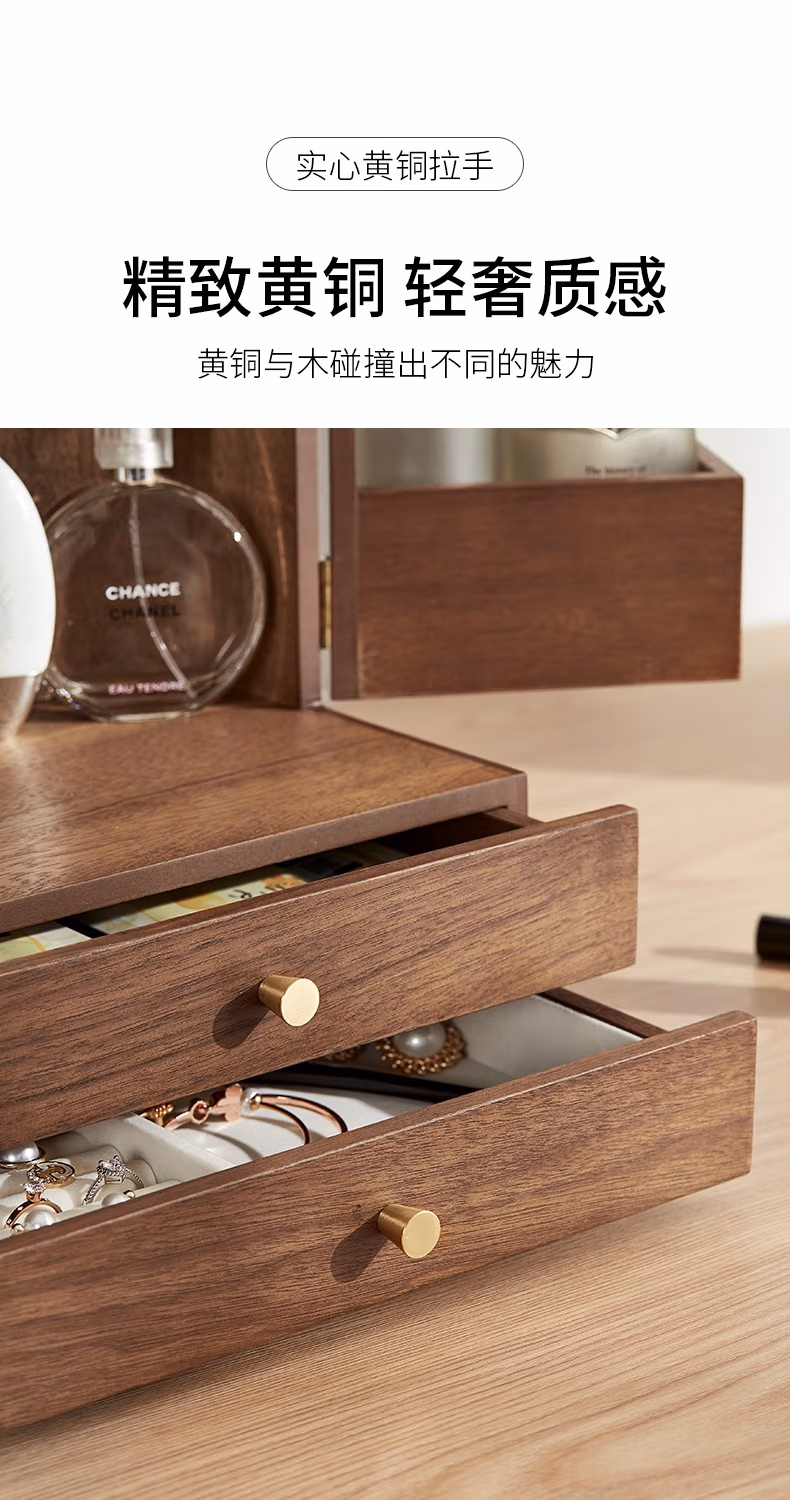 初心(CHOSIN)化妆品收纳盒带镜子生日礼物送女生桌面收纳护肤品口红妆台珠宝首饰盒化妆箱 方形化妆品收纳盒-胡桃木色